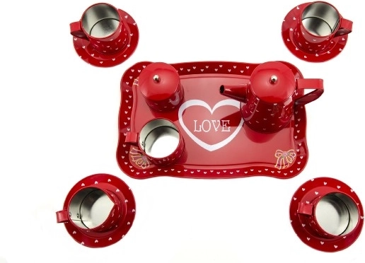 Червените съдове са декорирани с бели сърчица, което им придава романтична и същевременно игрива визия. Всеки елемент е внимателно съчетан, за да образува хармоничен комплект, който стимулира детското въображение.