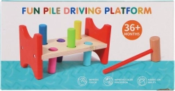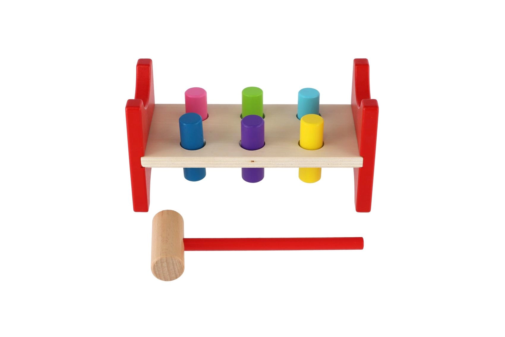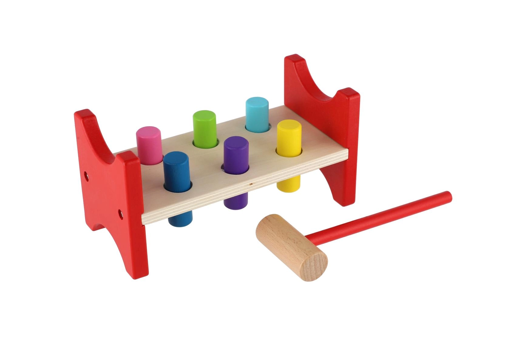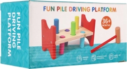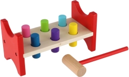 Тази непреходна дървена играчка подкрепя естественото учене чрез игра. Децата с помощта на чукчето забиват цветните колчета в отворите, с което тренират точността на движенията, ритъма и търпението. Здравата дървена пейка в комбинация с безопасно заоблени ръбове гарантира дълъг живот и безопасна употреба.