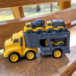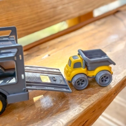 Големият носач с рампи позволява лесно товарене и превоз на трите превозни средства. Стабилната конструкция издържа и на интензивна детска игра.