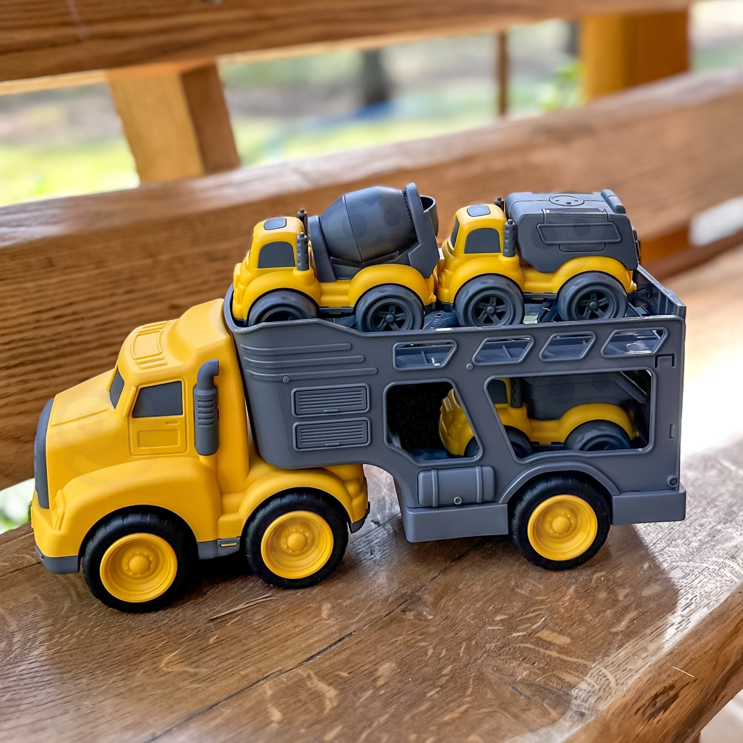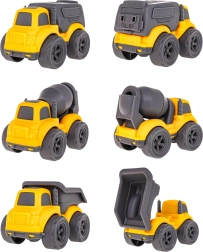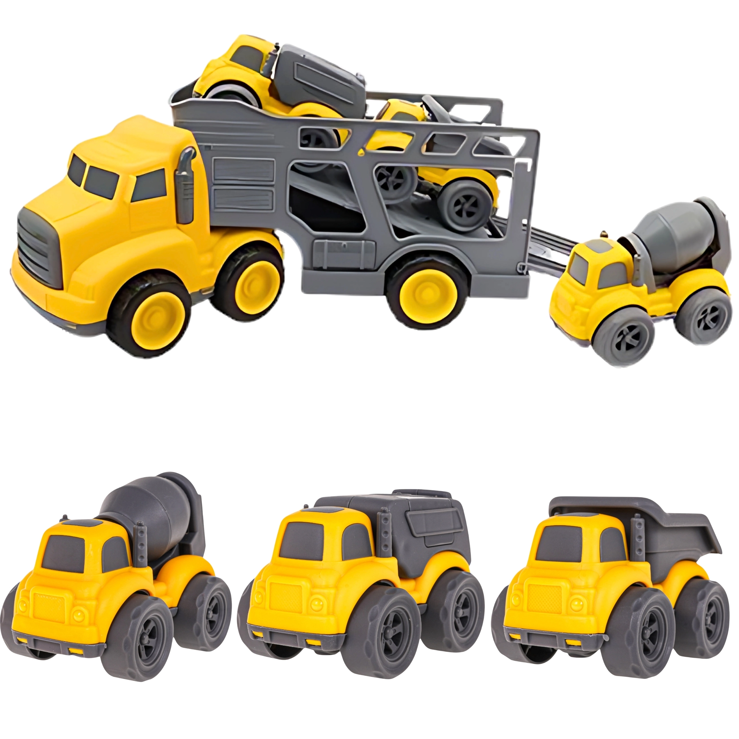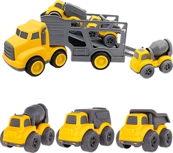Този универсален комплект 4в1 от WOOPIE пренася света на строежа директно в детската стая. Големият влекач с отделяща се платформа лесно транспортира три компактни превозни средства, които благодарение на подвижните части и търкалящото задвижване при малките автомобили подпомагат активната игра и развитието на фината и грубата моторика.