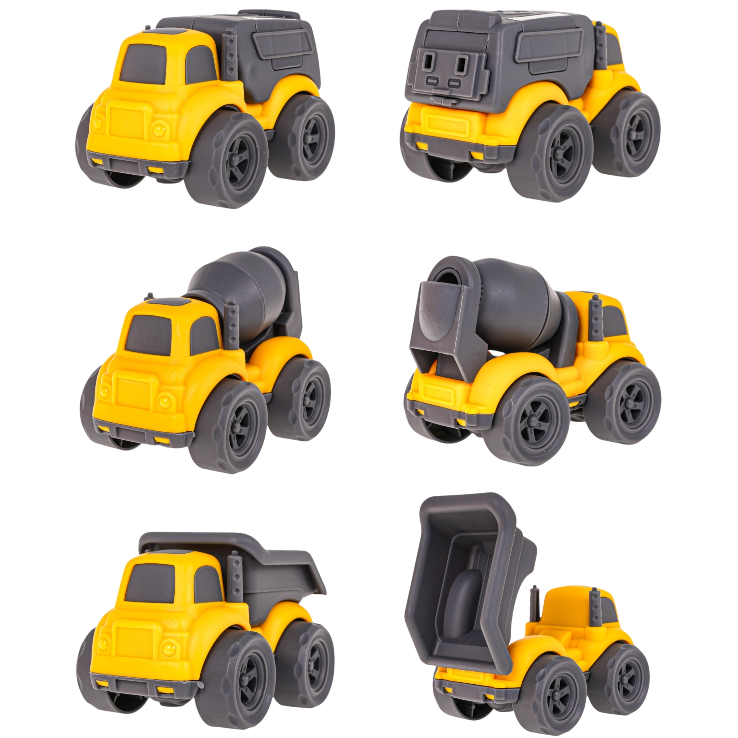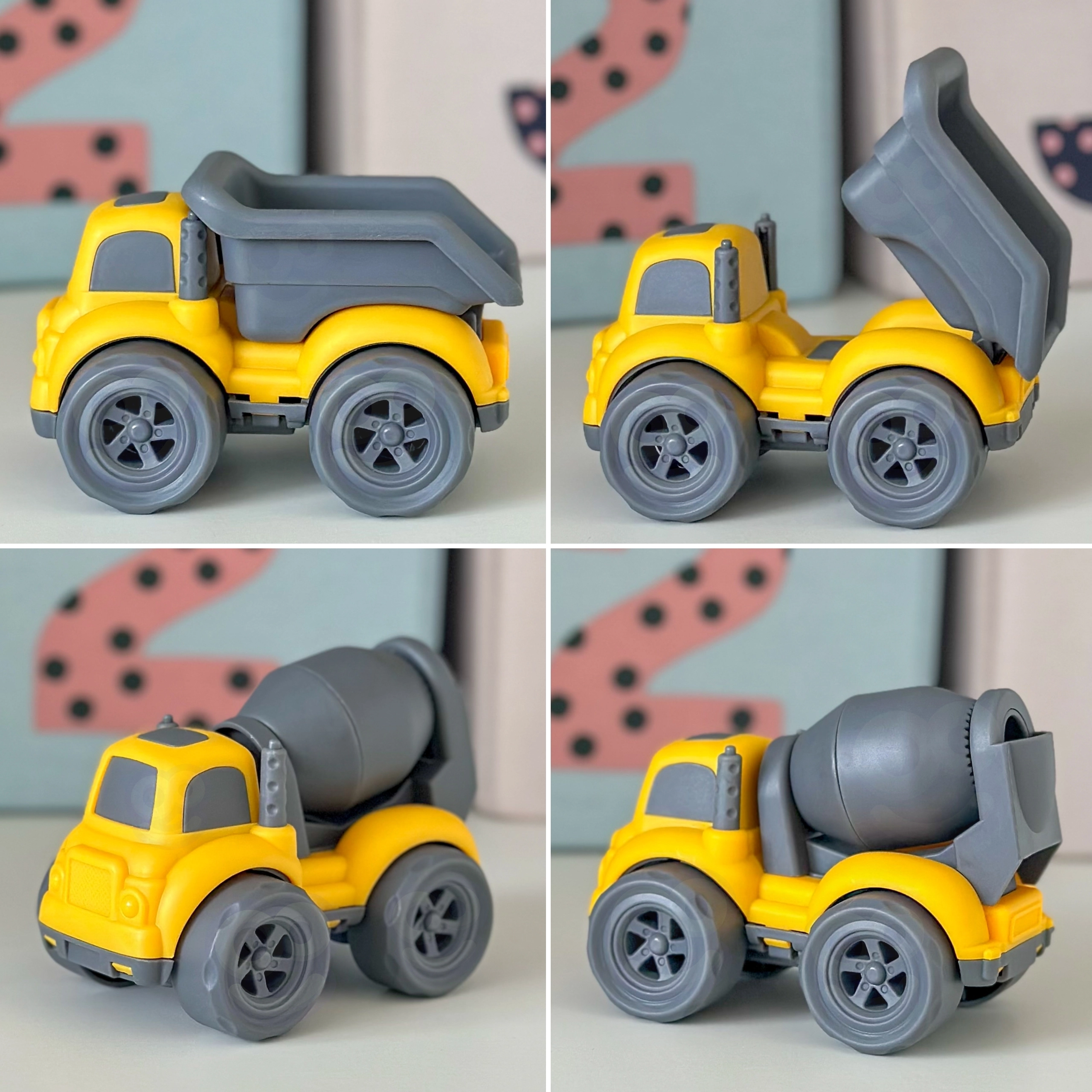 Самосвал със сгъваща се каросерия, бетоновоз с въртящ се барабан и сметосъбиращ камион за още по-реалистични сценарии на строежа.