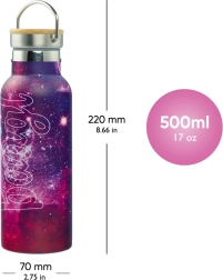 Тази термобутилка предлага елегантен дизайн в комбинация с практична употреба. Изработена е от неръждаема стомана с двойна стена, която осигурява задържане на температурата. Поддържа топли напитки до 12 часа и студени до 24 часа.