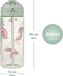 Открийте практичната и здравословна тританова бутилка за пиене с обем 500 ml. Бутилката е оборудвана с интегрирана мека сламка и сгъваем накрайник за лесно пиене. С тегло едва 135 g е лека и лесна за пренасяне. Изработена е от безвреден за здравето материал – тритан, което я прави безопасен избор за ежедневна употреба.