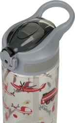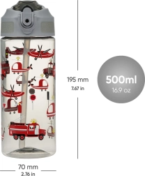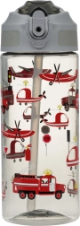 Прозрачна пластмасова бутилка с изображения на червени пожарни автомобили и хеликоптери, идеална за забавление с всяка глътка.