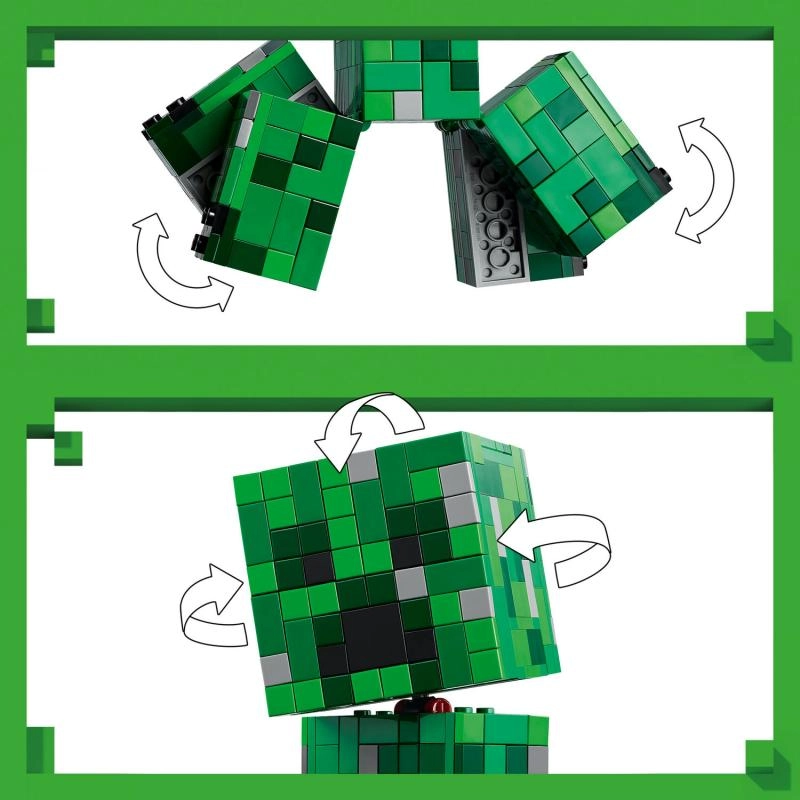 Сглобете легендарния враг от MINECRAFT! Голямата фигурка на Крийпър от LEGO предлага подвижна глава и крака, скрито вътрешно отделение с мини версия на Крийпър и елемент TNT и е чудесна както за игра, така и като декорация за стаята на всеки геймър. Идеален подарък за деца от 10 години и фенове на MINECRAFT.