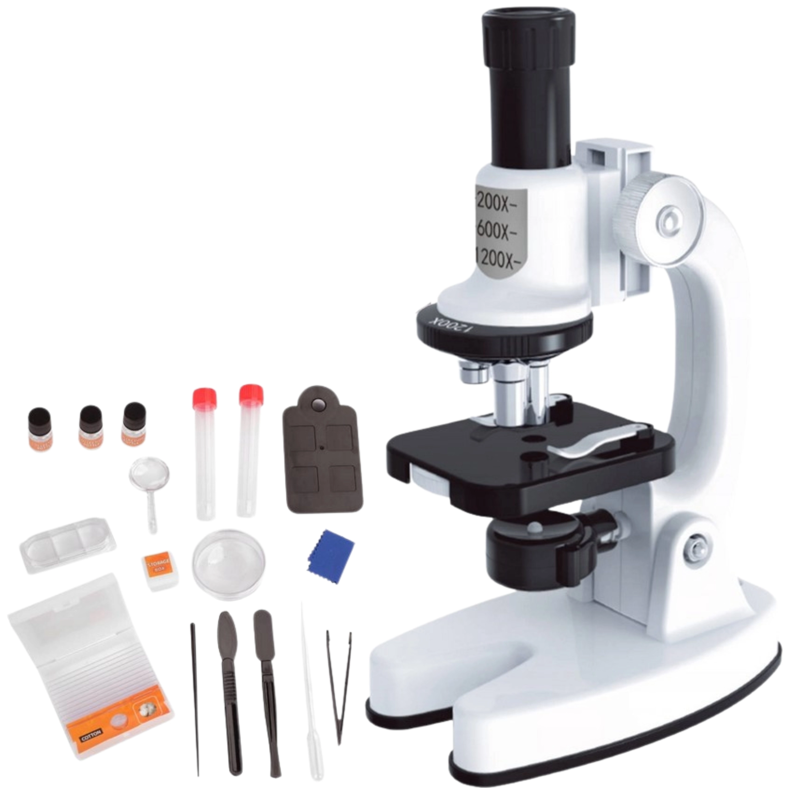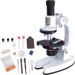 Този компактен микроскоп е перфектен избор за първа домашна лаборатория. Благодарение на трите нива на увеличение 200x / 600x / 1200x, вграденото LED осветление и въртящия се цветен филтър децата лесно ще виждат структури на растителни клетки, влакна и фини детайли на малки проби.