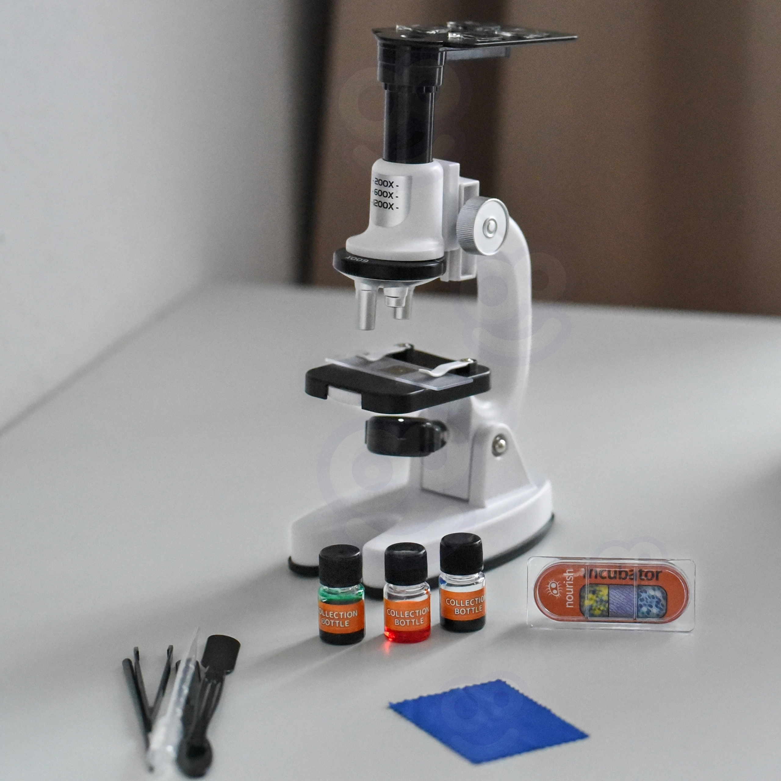 Предметни стъкла, покривни стъкла, шишенца, пинсета, пипета, инструменти и кутия за съхранение – всичко, от което децата се нуждаят за подготовка и наблюдение на проби.