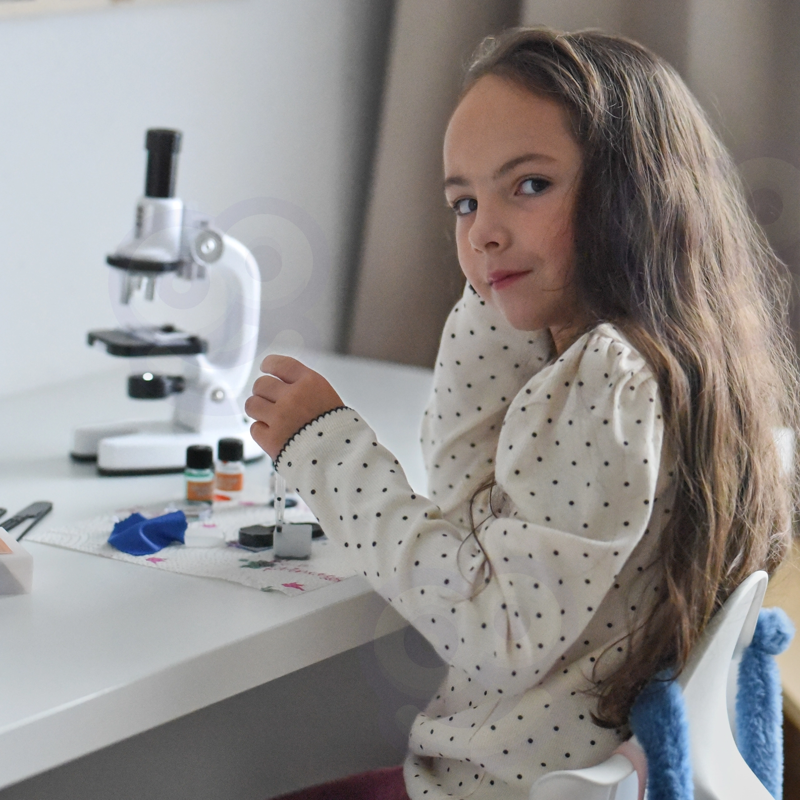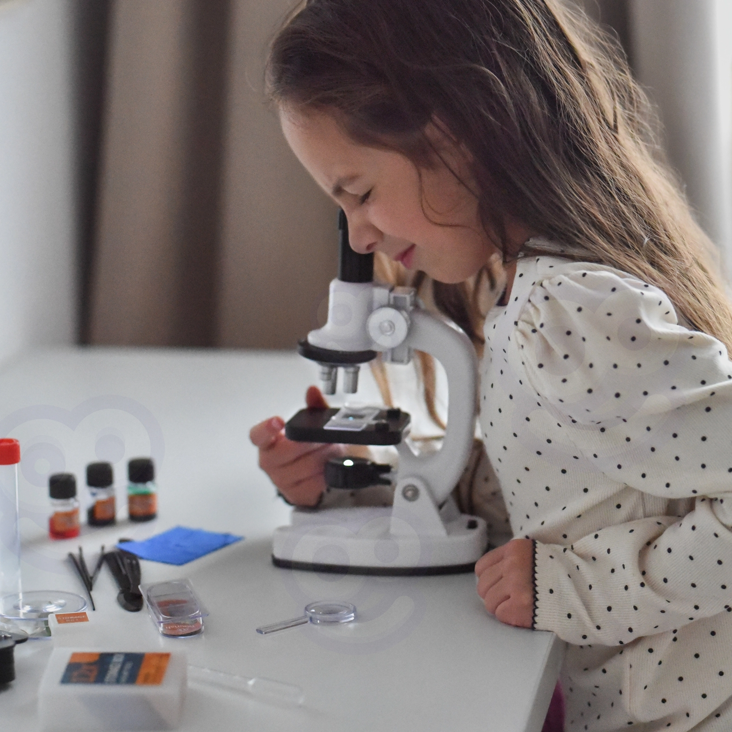 Включен е адаптер за смартфон, така че може удобно да се снимат и споделят наблюдения. Богатият комплект аксесоари (стъкла, шишенца, пинсета, пипета и др.) подпомага безопасни и забавни експерименти и развива научни умения, търпение и координация око-ръка.