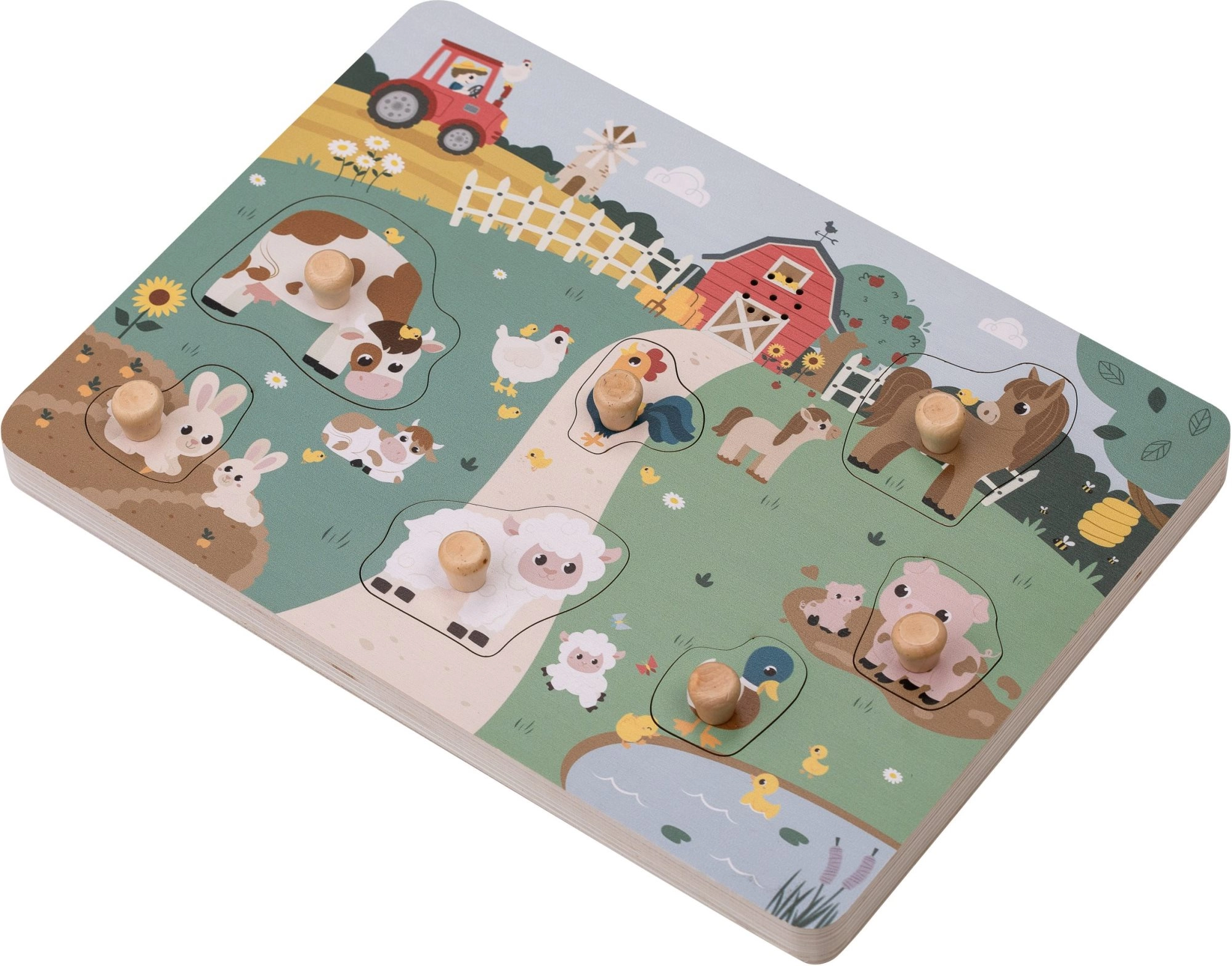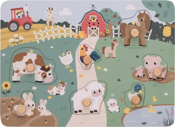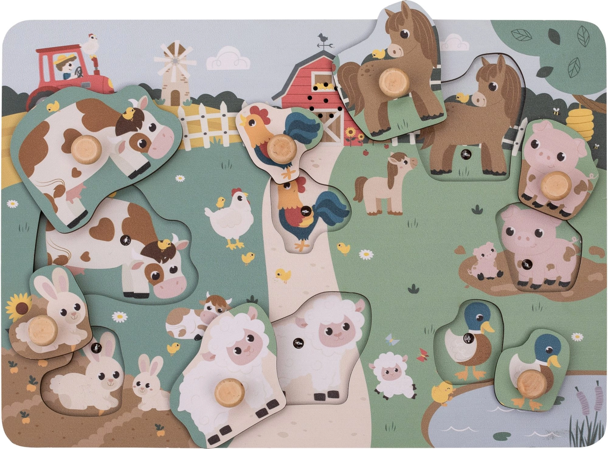 Дървен звуков пъзел с мотив на фермерски животни, които при поставяне издават своите характерни звукoве. Перфектно забавление за деца, развиващо тяхното въображение и фина моторика.