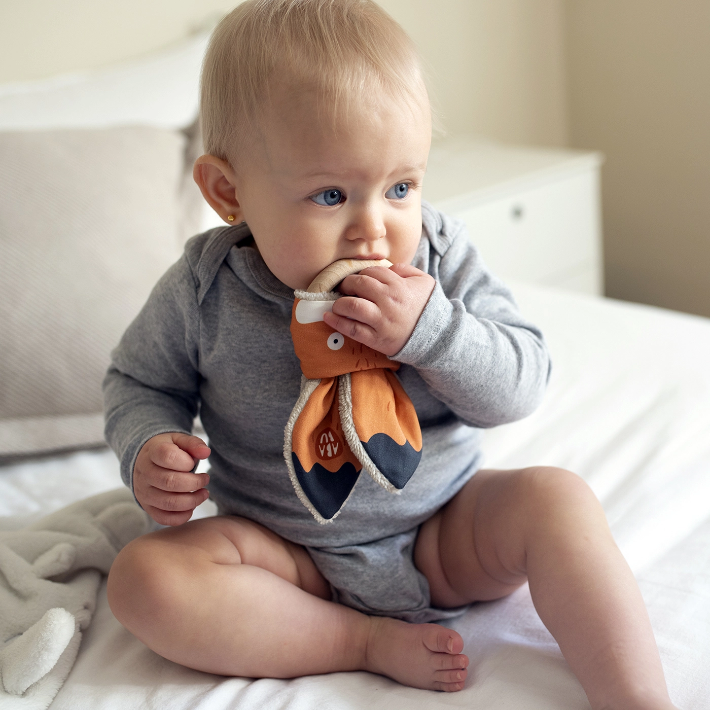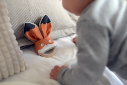 За поддръжка препоръчваме пране на ушичките на 30° и редовна подмяна на износения пръстен. Дъвкалката се доставя върху подаръчен картон, което е идеално за подаряване.