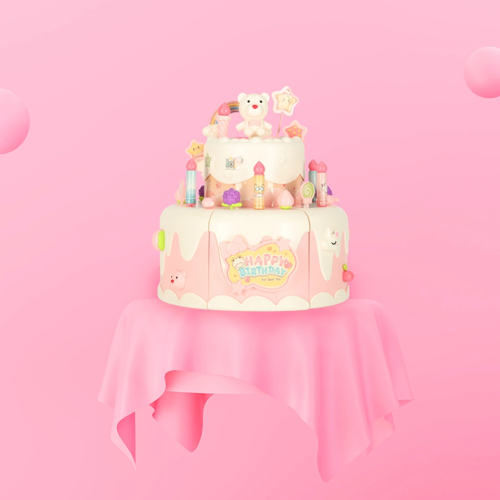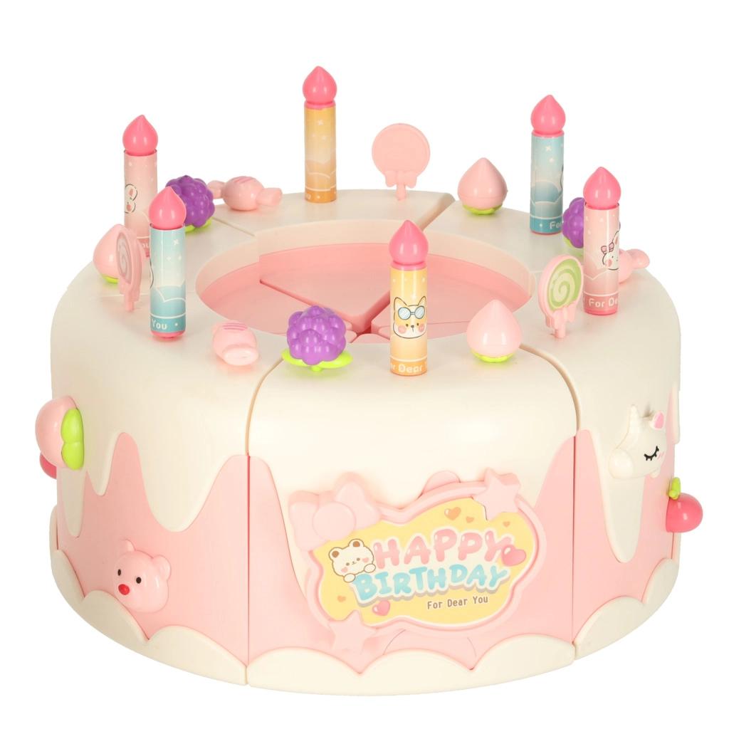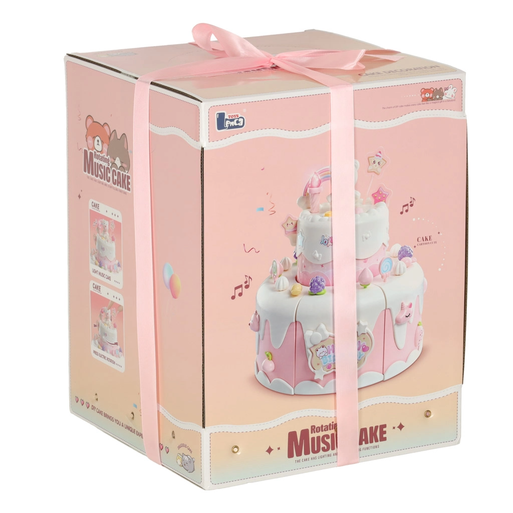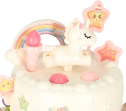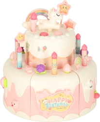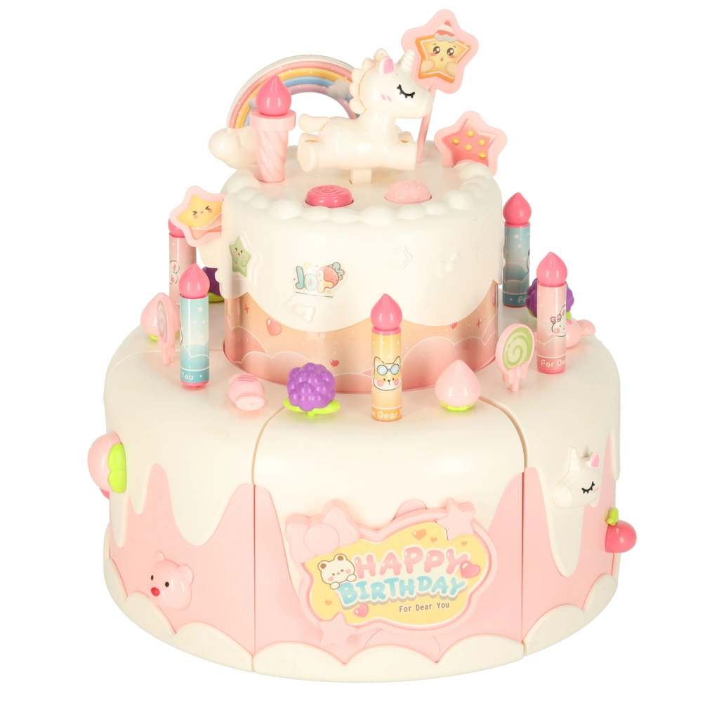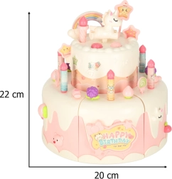 Двуетажната рожденденска торта, изработена от висококачествена пластмаса, е идеалната играчка за деца над 3 години. Развива детската креативност и фината моторика благодарение на интерактивни елементи като въртене и музикални ефекти. Комплектът включва сладки фигурки на меченце и еднорог, шест свещички и допълнителни аксесоари.