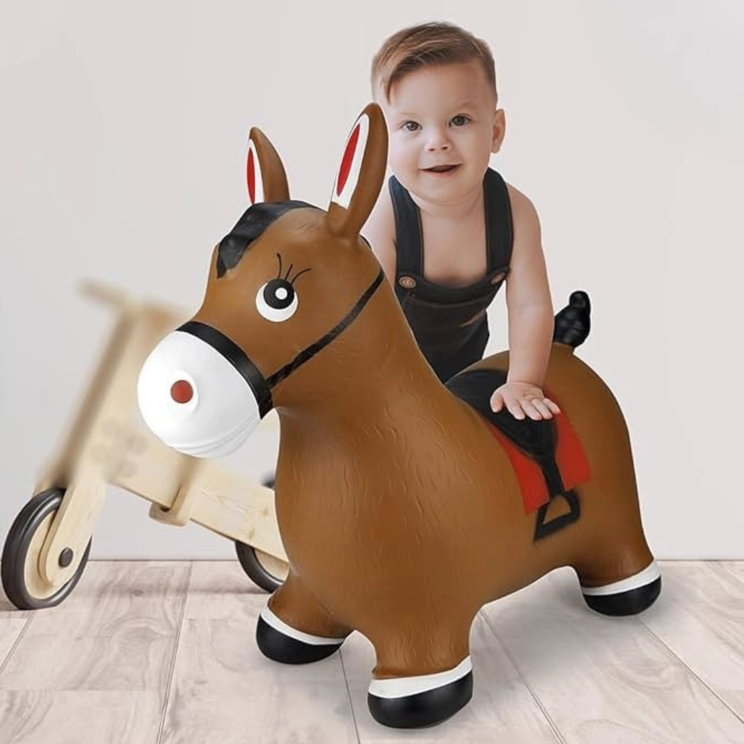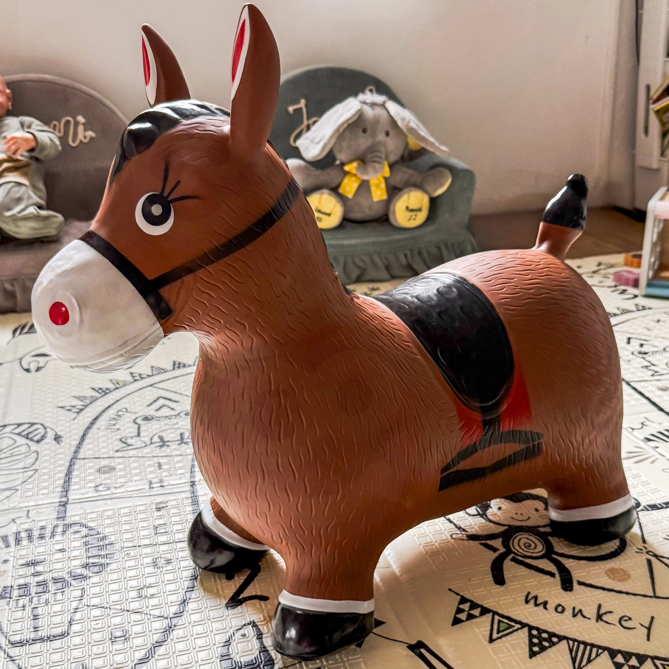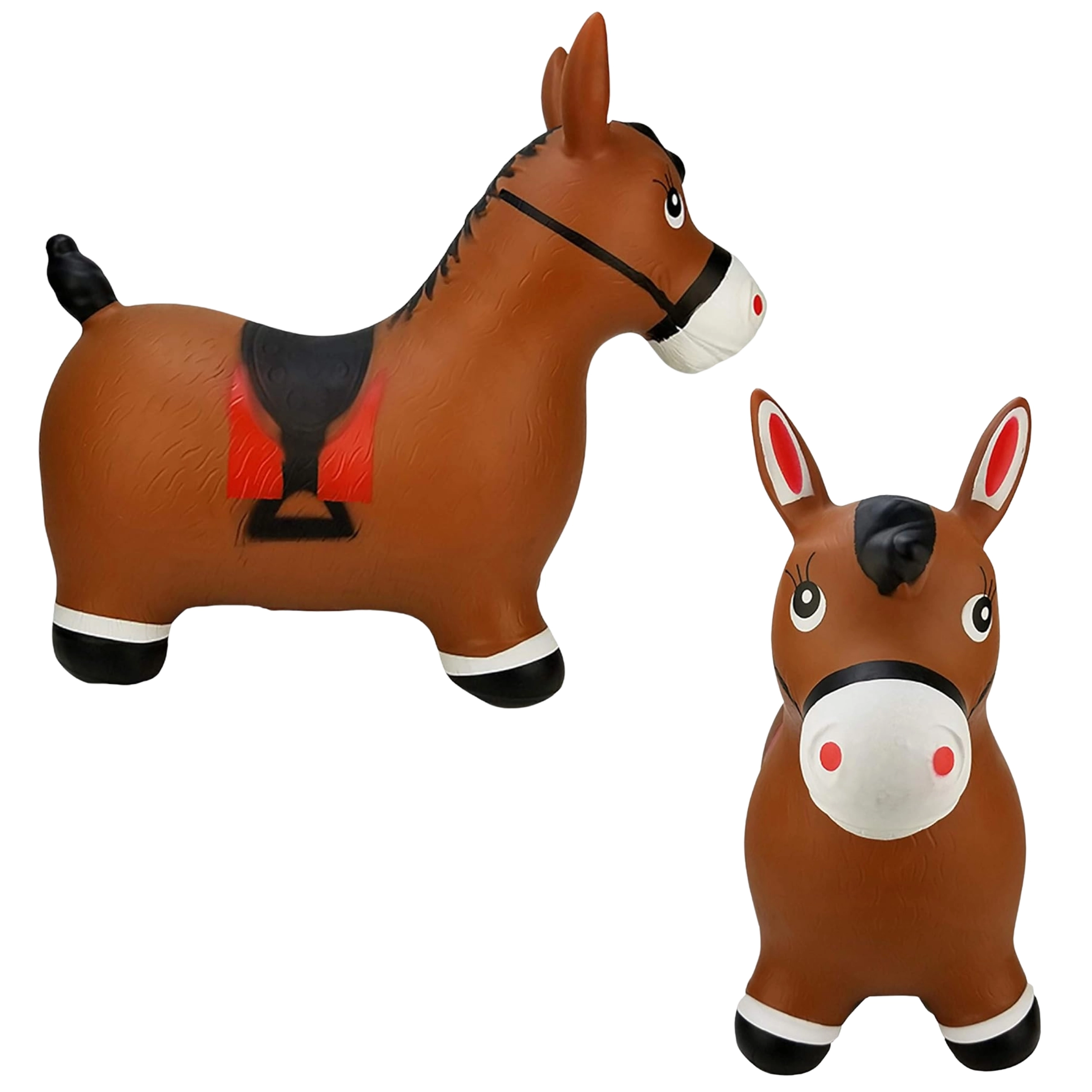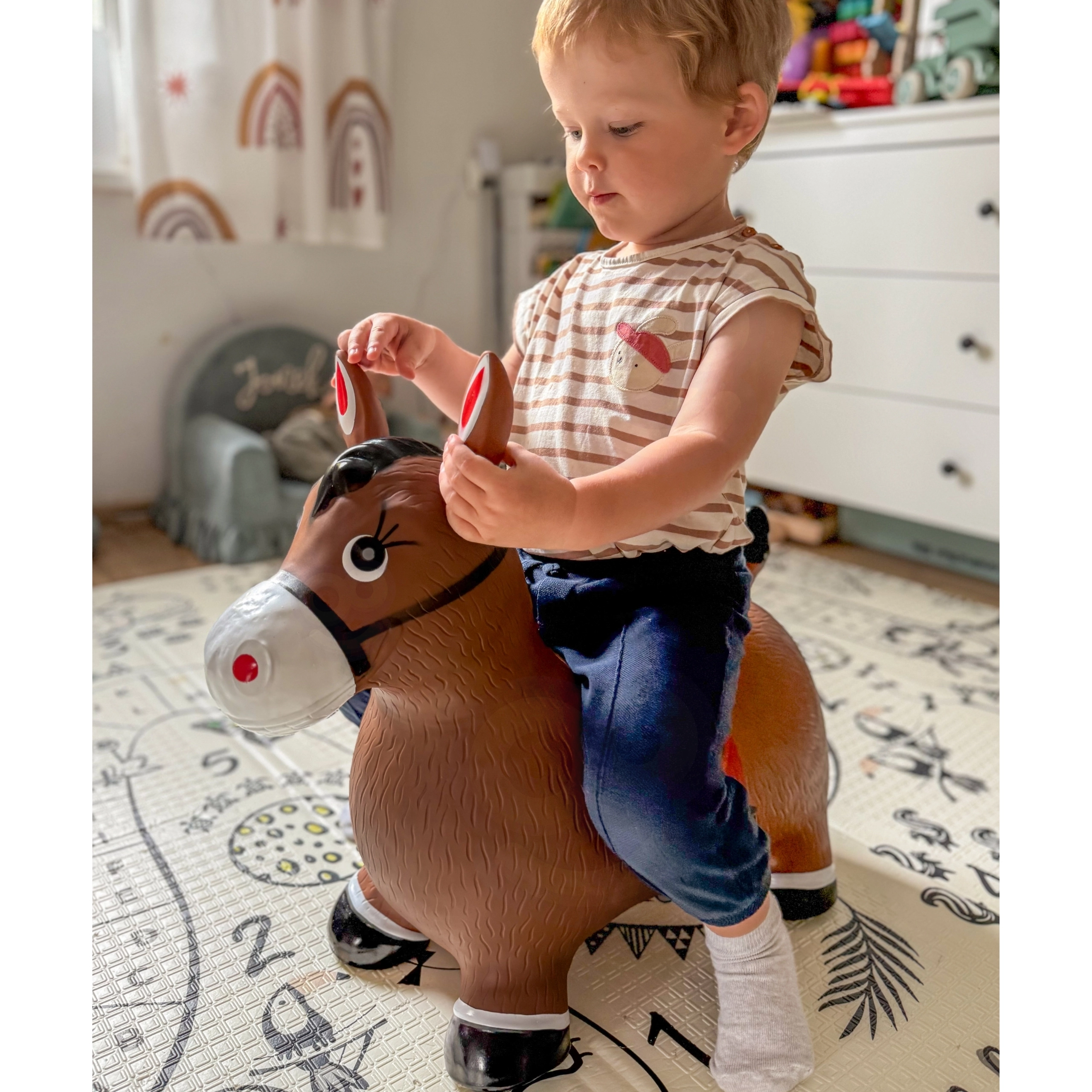 Яркият дизайн на сладкото кафяво конче със седло мотивира към игра и насърчава фантазията. Максималното натоварване е 45 kg и препоръчаното налягане 0,3–0,4 bar осигурява правилна еластичност за удобно скачане. Комплектът включва практична помпа, така че забавлението може да започне веднага след разопаковане.