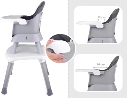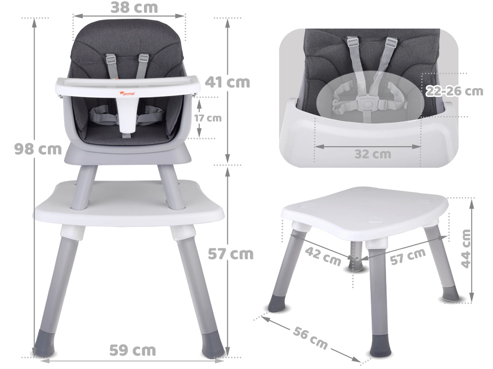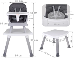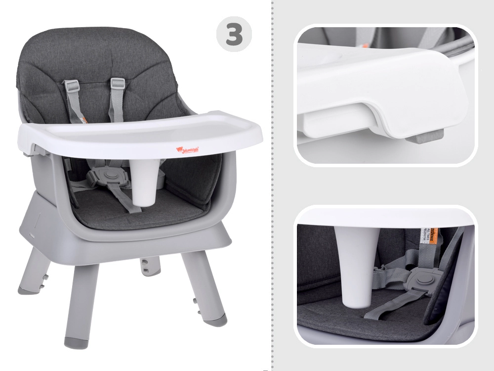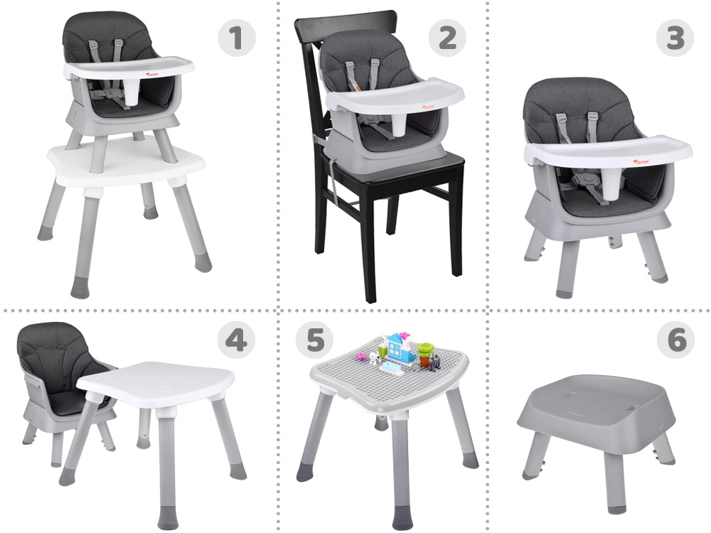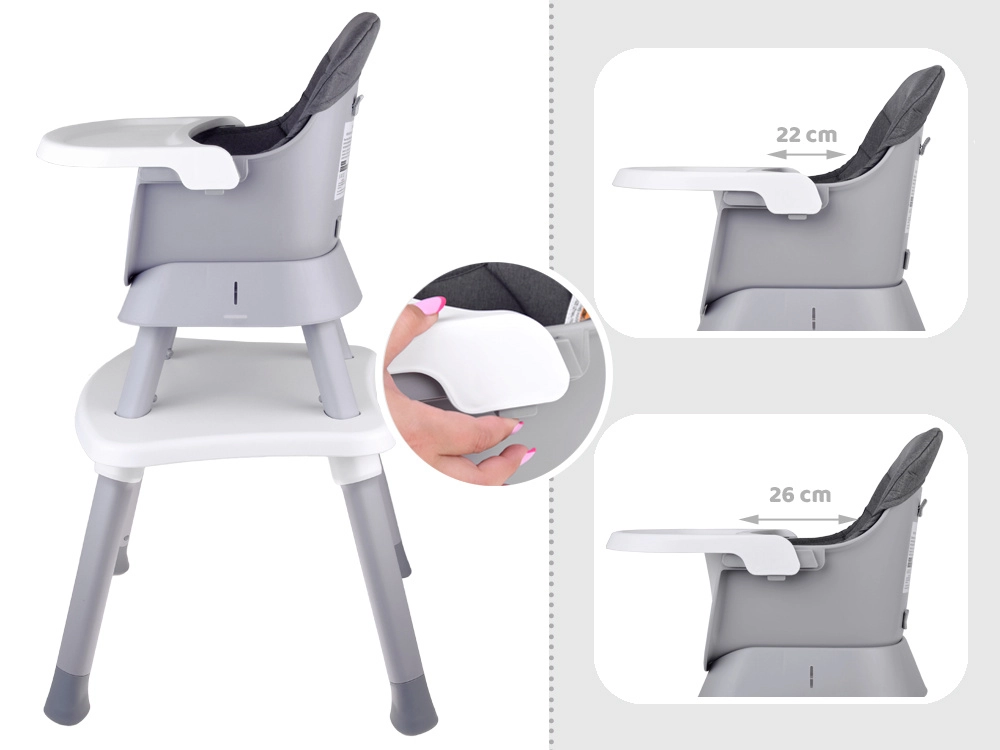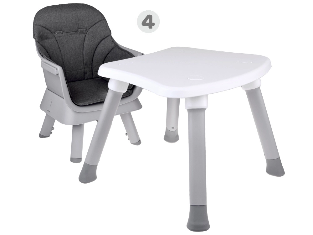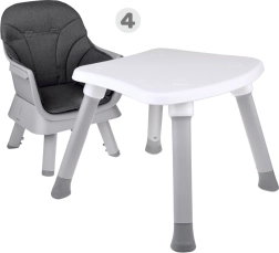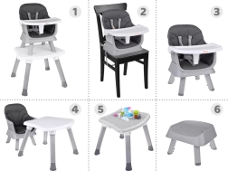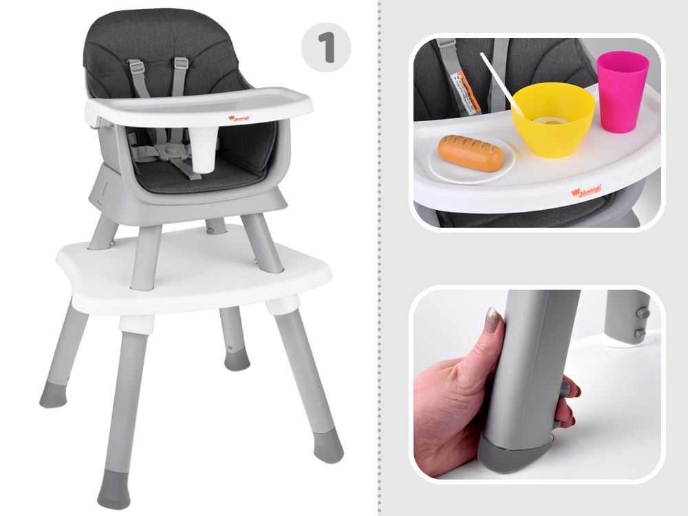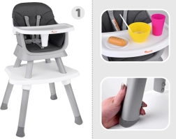 Многофункционалното столче за хранене 6 в 1 е идеалното решение за родители, търсещи практично и стилно оборудване, което се адаптира към променящите се нужди на детето. От столче за самостоятелно хранене, през детско столче, до пълен комплект маса и стол за игра и учене.