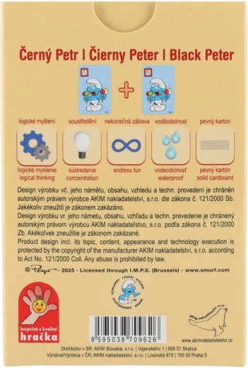 Насладете се на класическата игра Черен Петър в очарователен смърфски стил! Картите с цветни илюстрации на СМЪРФОВЕТЕ ще зарадват деца и възрастни и гарантират много забавление у дома и в движение. Компактната опаковка лесно се побира в джоб, раница или куфар.