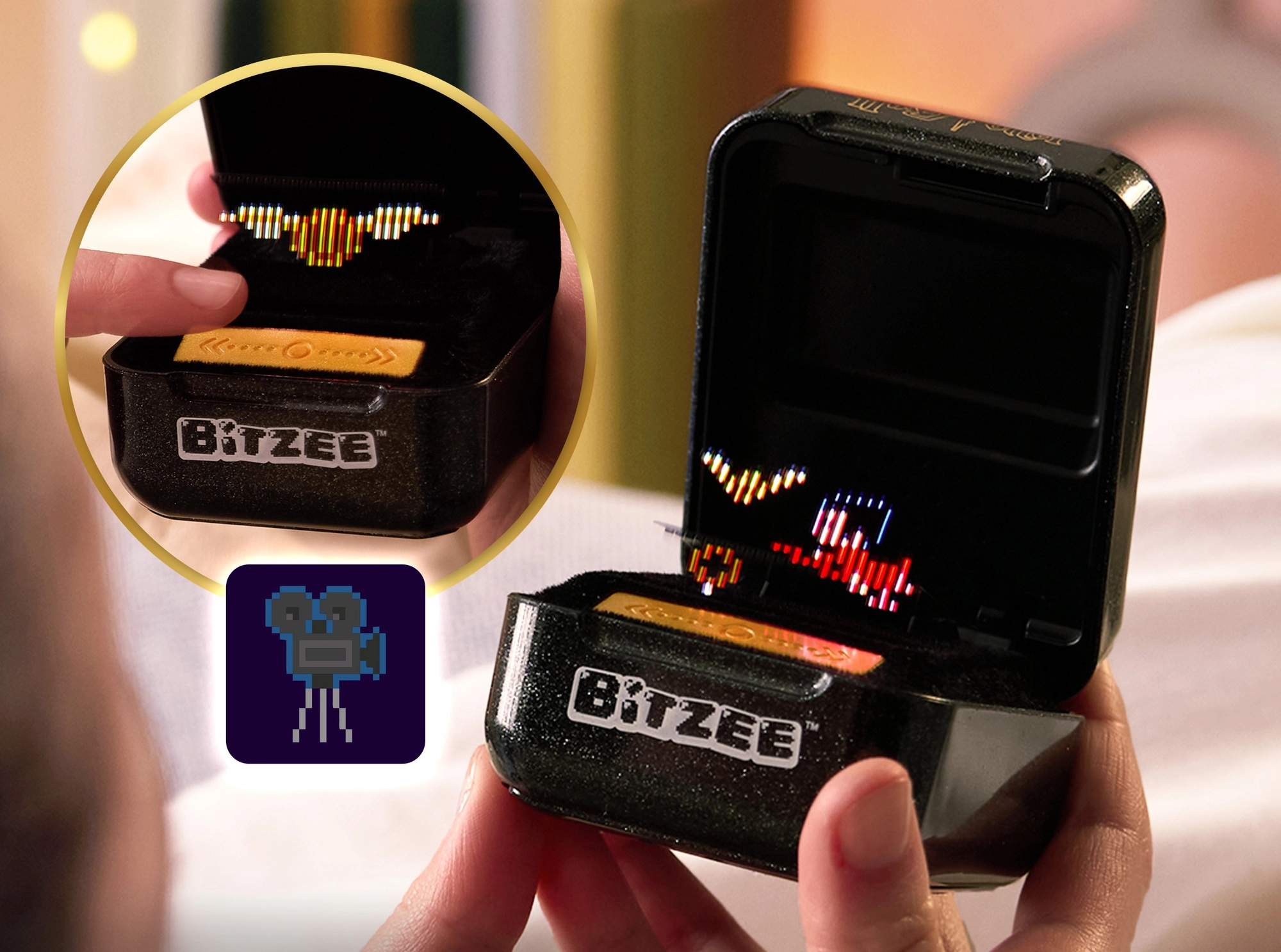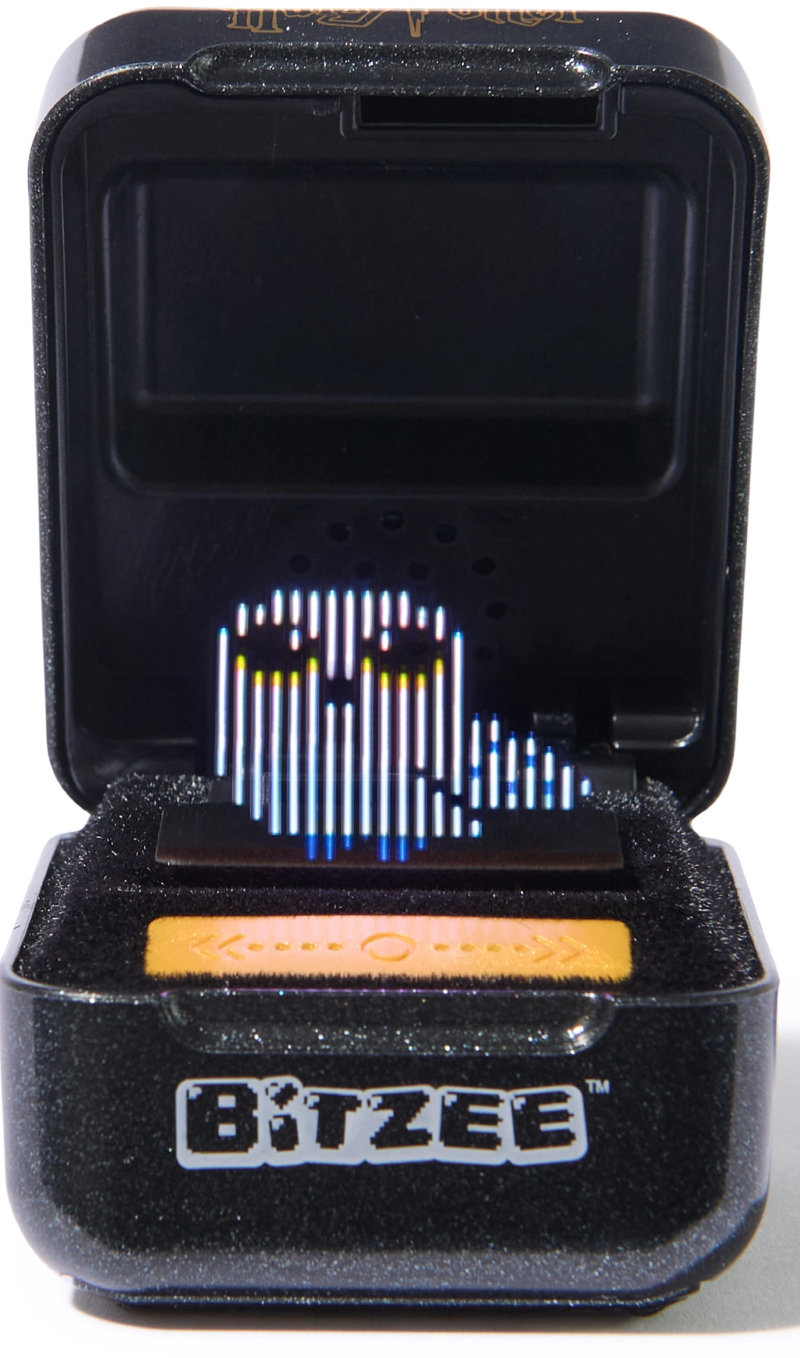 Bitzee HARRY POTTER е стилна черно-златна капсула с герба на Hogwarts, която оживява благодарение на уникалното холографско изображение. Реагира на докосване, плъзгане, накланяне и разклащане и ви възнаграждава с магически звуци и анимации. Всяка интеракция движи играта напред и носи нови персонажи и изживявания, вдъхновени от филмите.