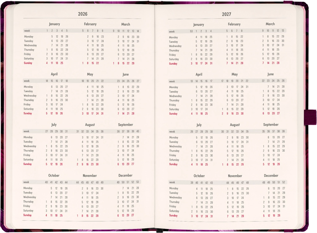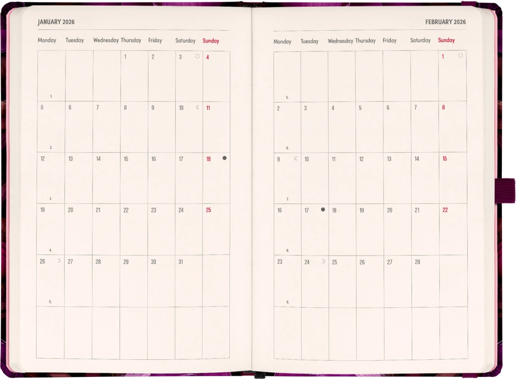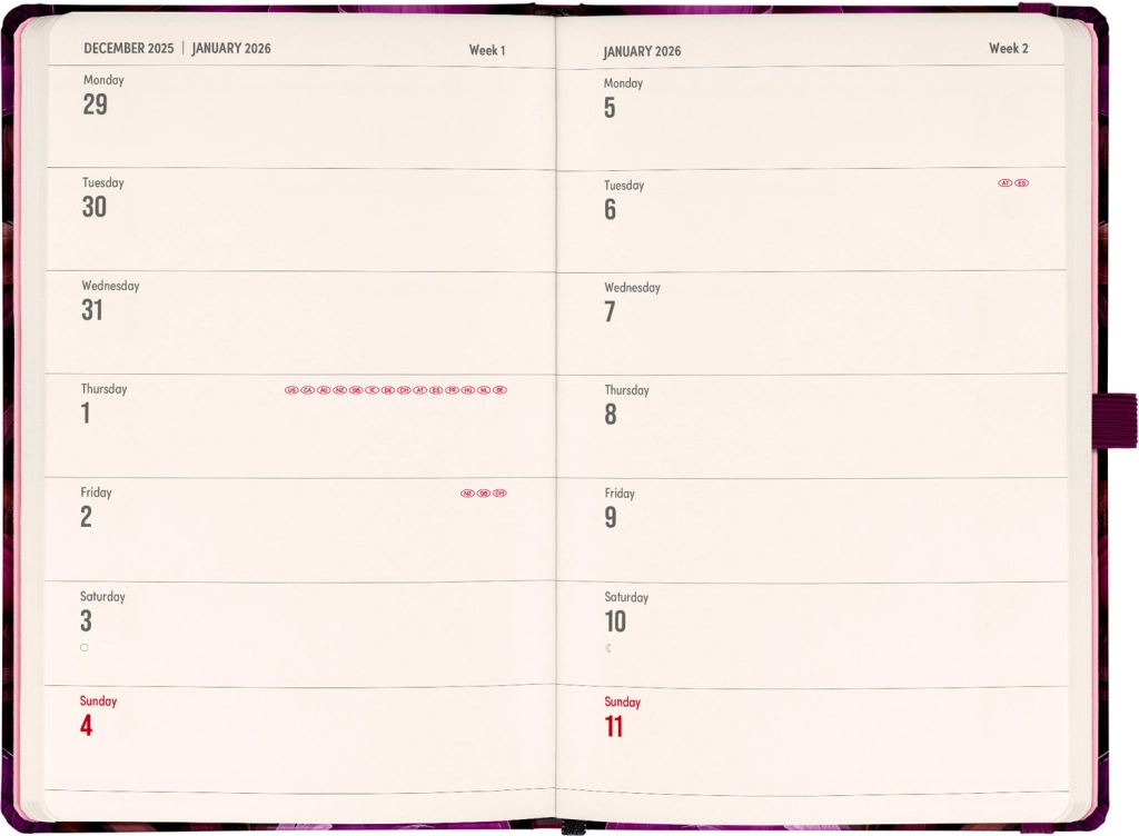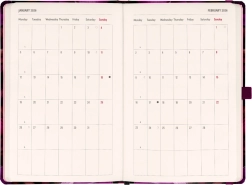 - Стилният дизайн „Лилави цветя“ придава елегантност на вашето планиране.