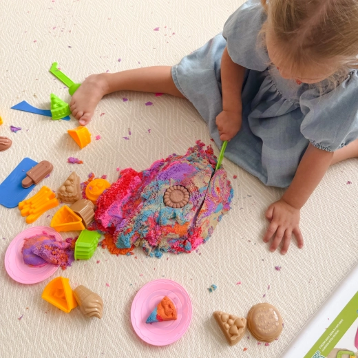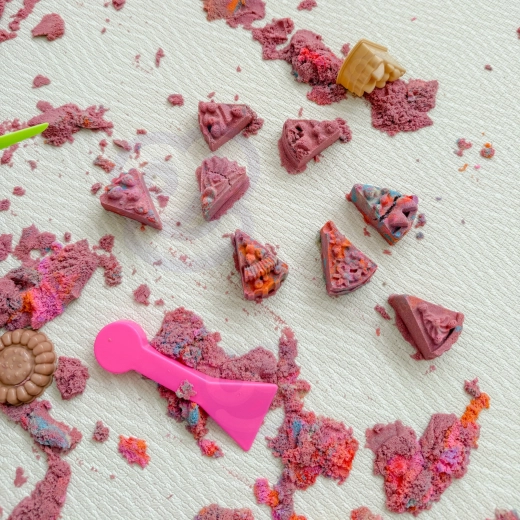 Специалният състав на пясъка е приятен на допир, лесно се реже, разточва и притиска във формички, като същевременно не изсъхва и задържа форма. Децата могат да „готвят“ и сервират десерти в чинийки, да използват лопатки, ножчета и точилка и да създават детайлни текстури с помощта на прес форми.