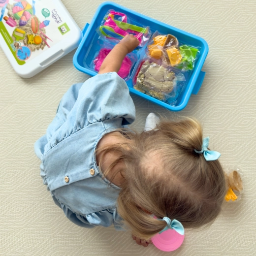 Пясъкът е мек, оформяем, не изсъхва и не полепва по ръце или повърхности. Подпомага фината моторика, координацията и въображението.
