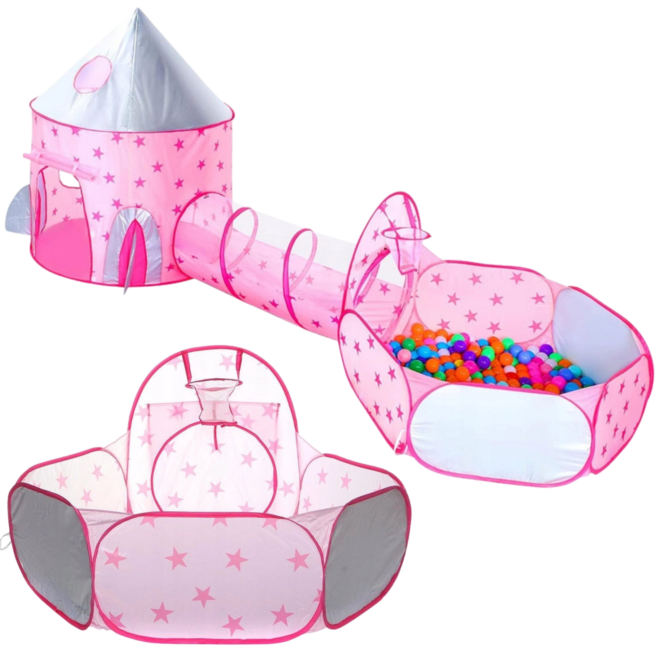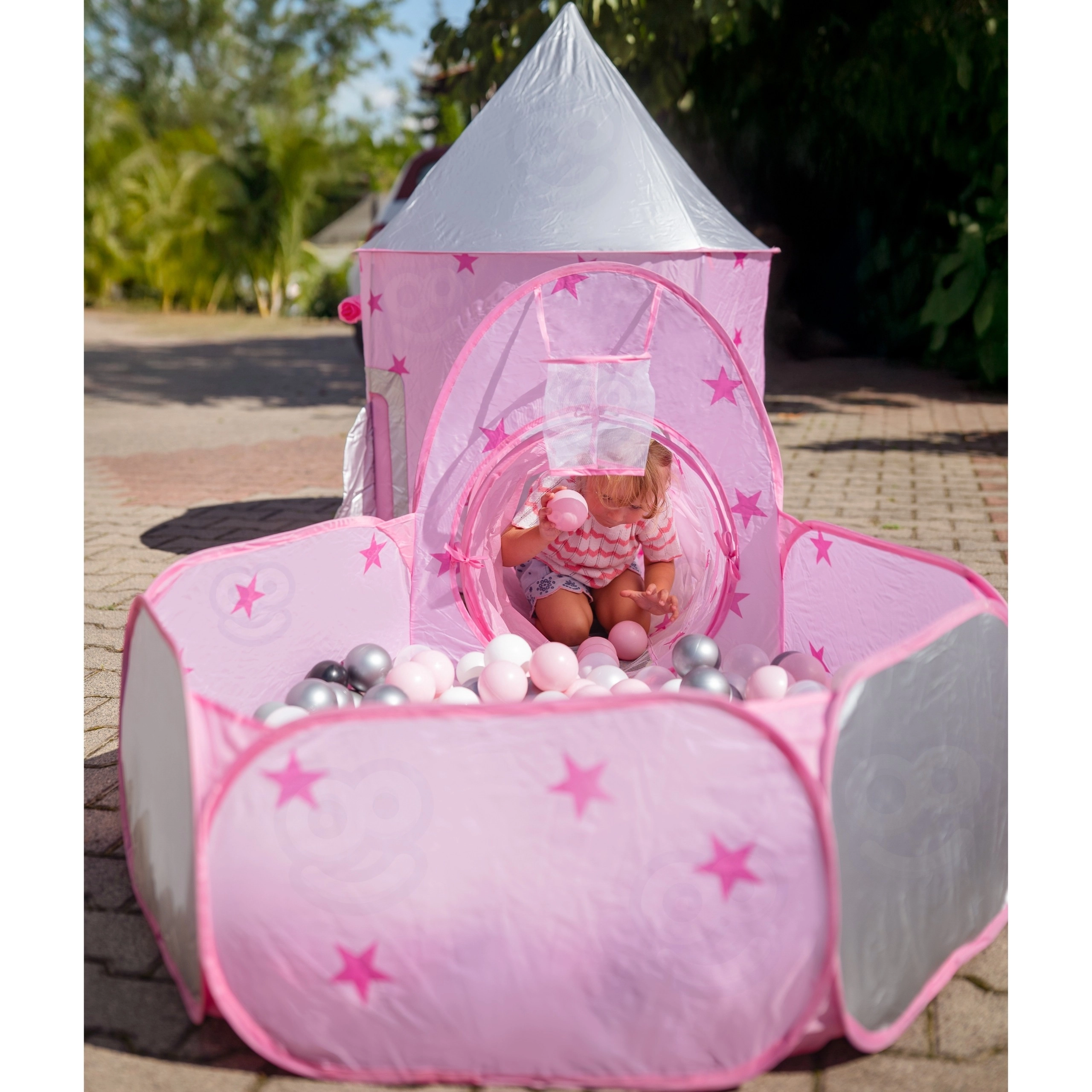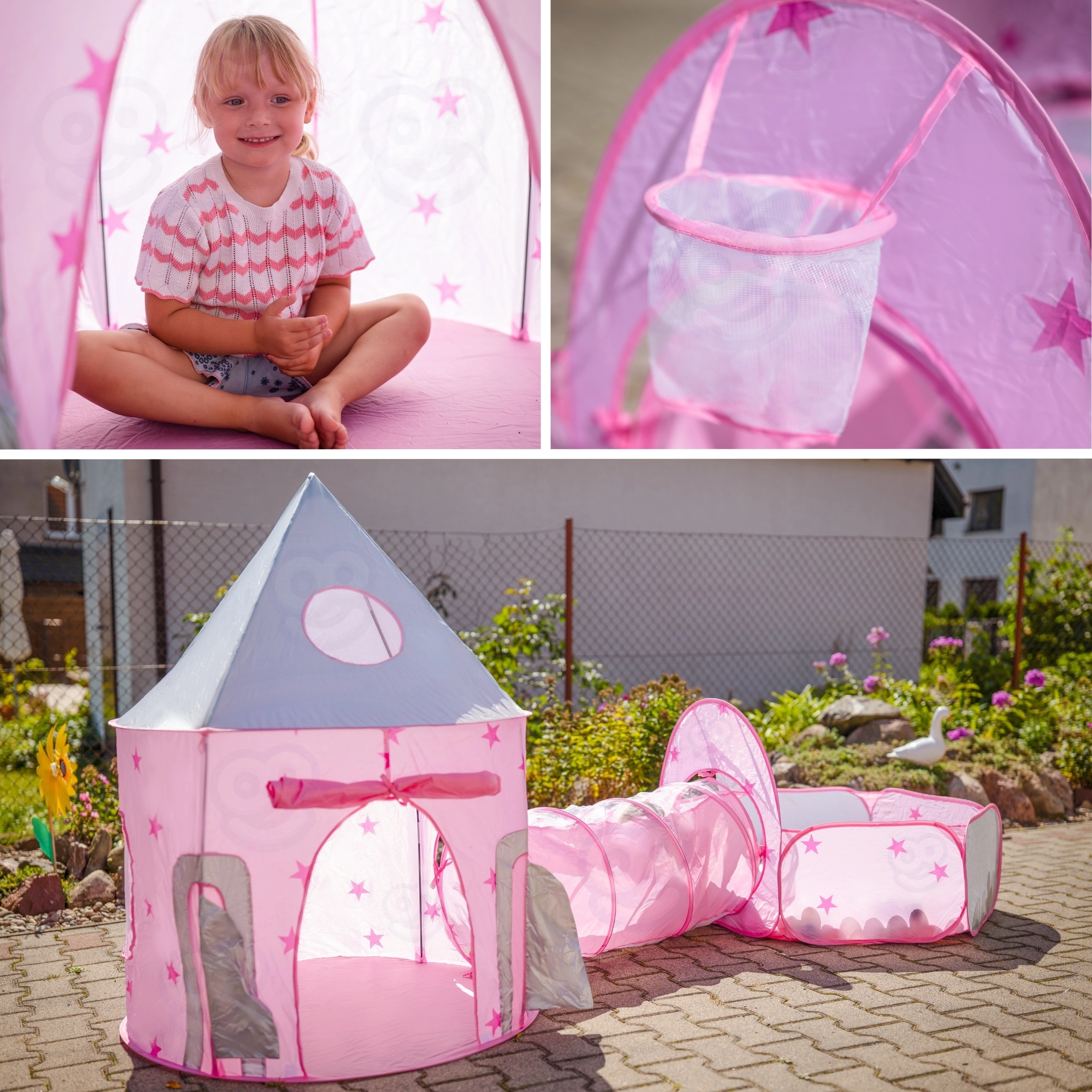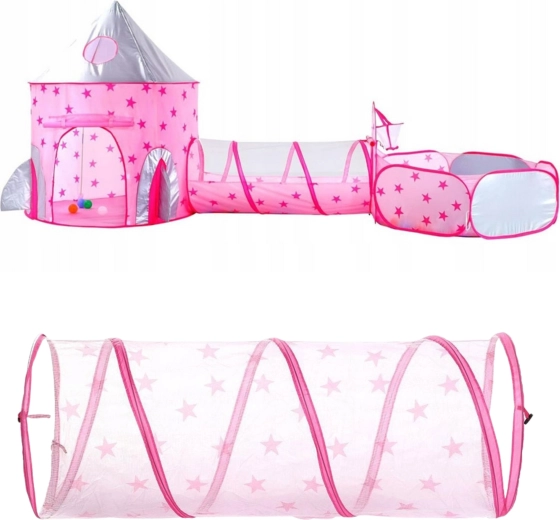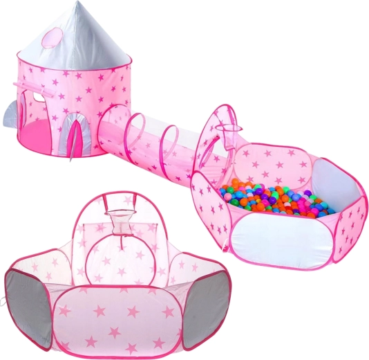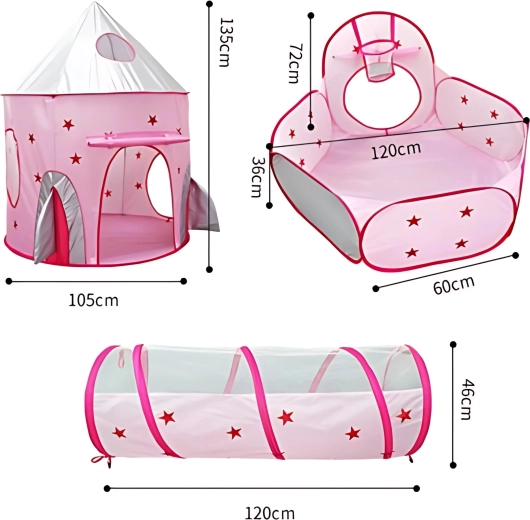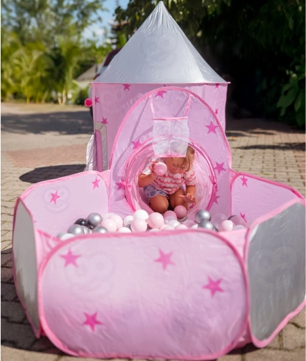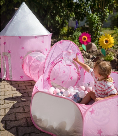 Розовият игрален комплект 3-в-1 на Woopie превръща всяка стая и градина във вълшебно кралство. Съдържа палатка във форма на замък, свързващ тунел и просторен сух басейн. Благодарение на pop-up конструкцията се разпъва и сгъва лесно и е идеален за активно играене, развиване на въображението и споделено забавление. Лек, сгъваем, с вентилируема мрежа и чудесен за употреба на закрито и открито.