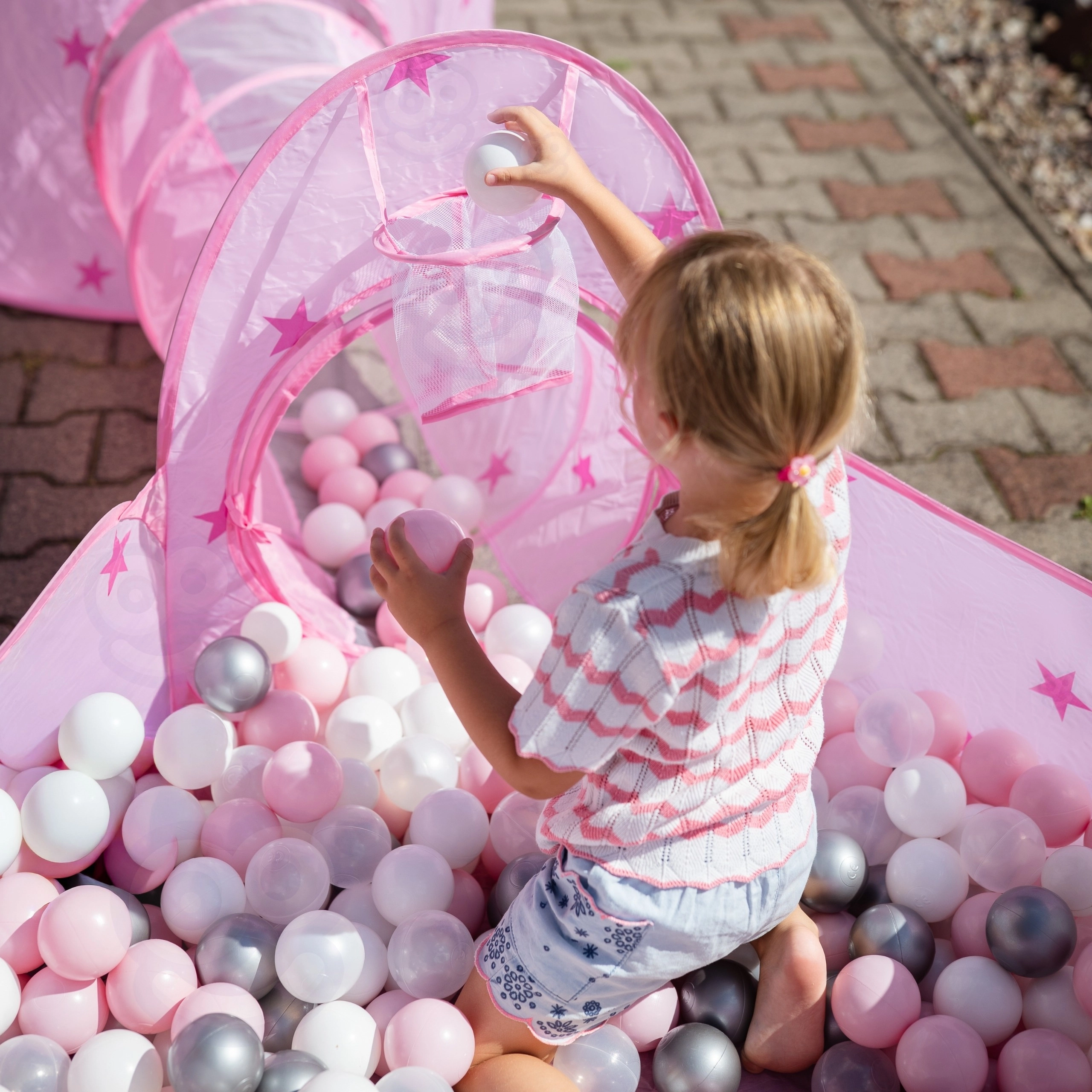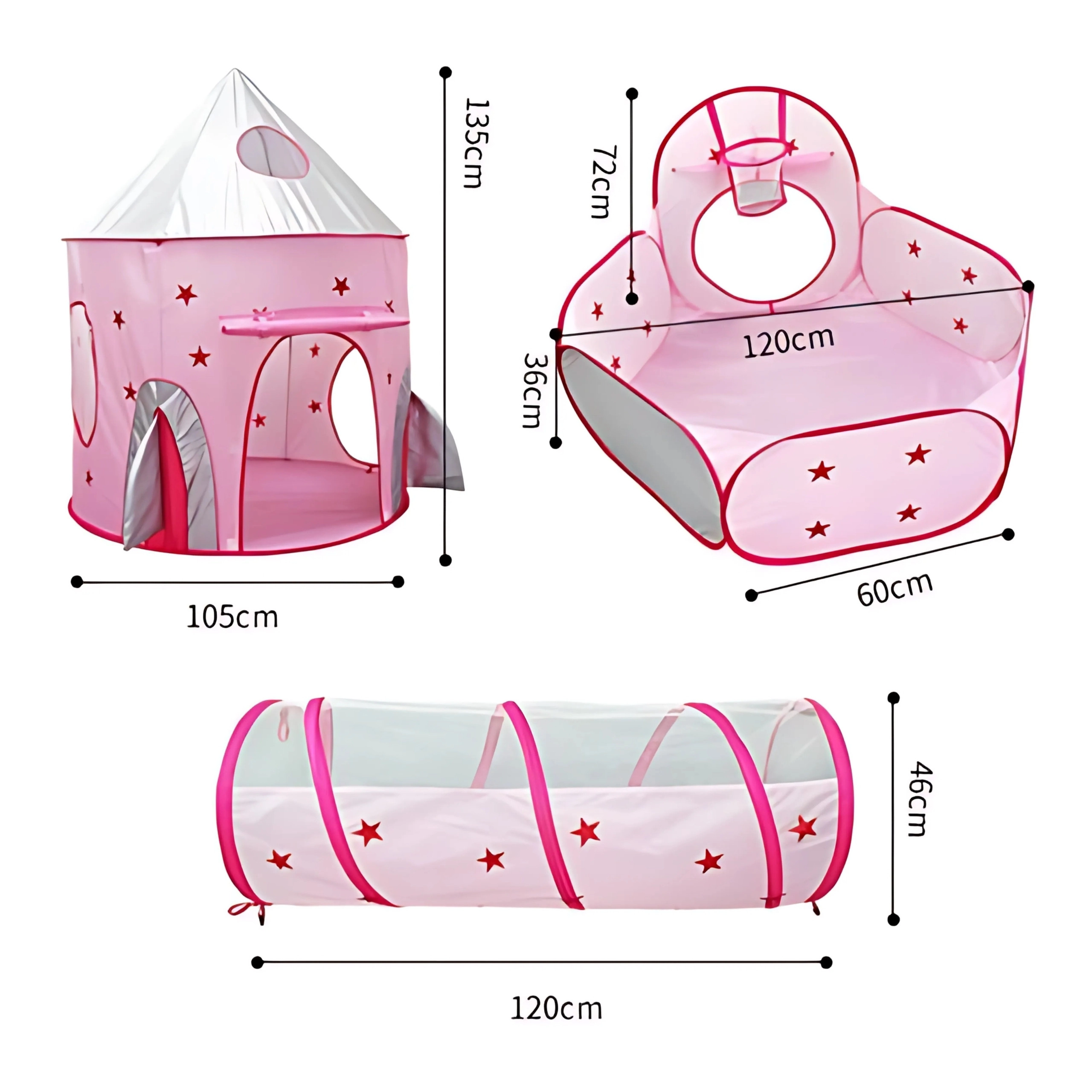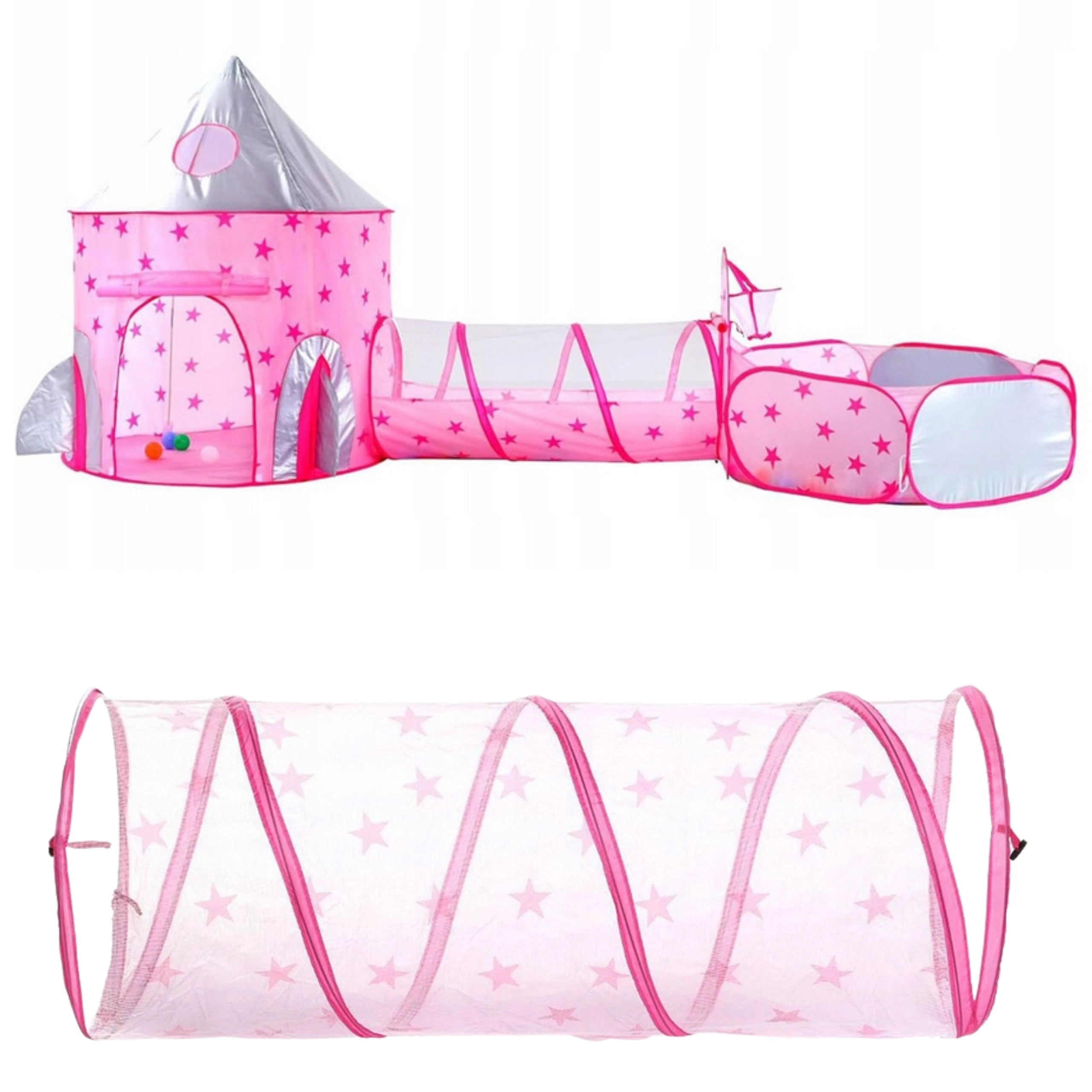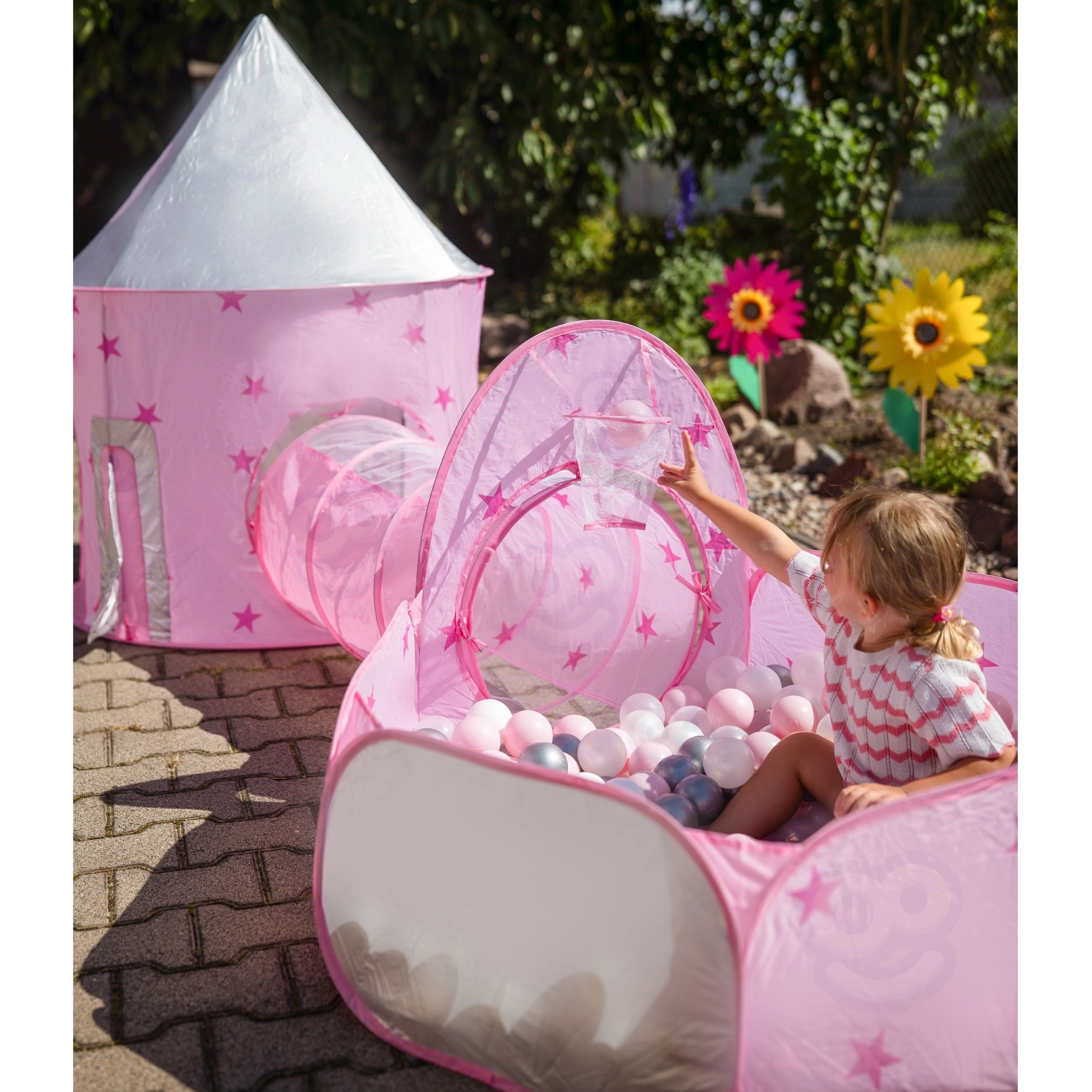 Розовият игрален комплект 3-в-1 на Woopie превръща всяка стая и градина във вълшебно кралство. Съдържа палатка във форма на замък, свързващ тунел и просторен сух басейн. Благодарение на pop-up конструкцията се разпъва и сгъва лесно и е идеален за активно играене, развиване на въображението и споделено забавление. Лек, сгъваем, с вентилируема мрежа и чудесен за употреба на закрито и открито.