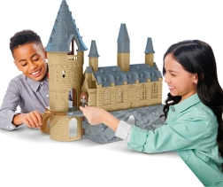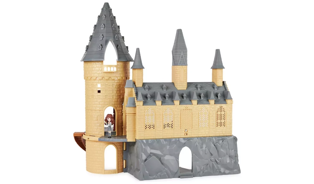 Замъкът има детайлни архитектурни елементи и ярки цветове, които подчертават магията на света на Хари Потър.