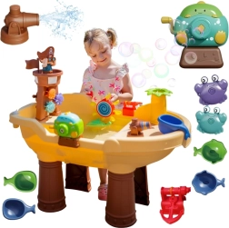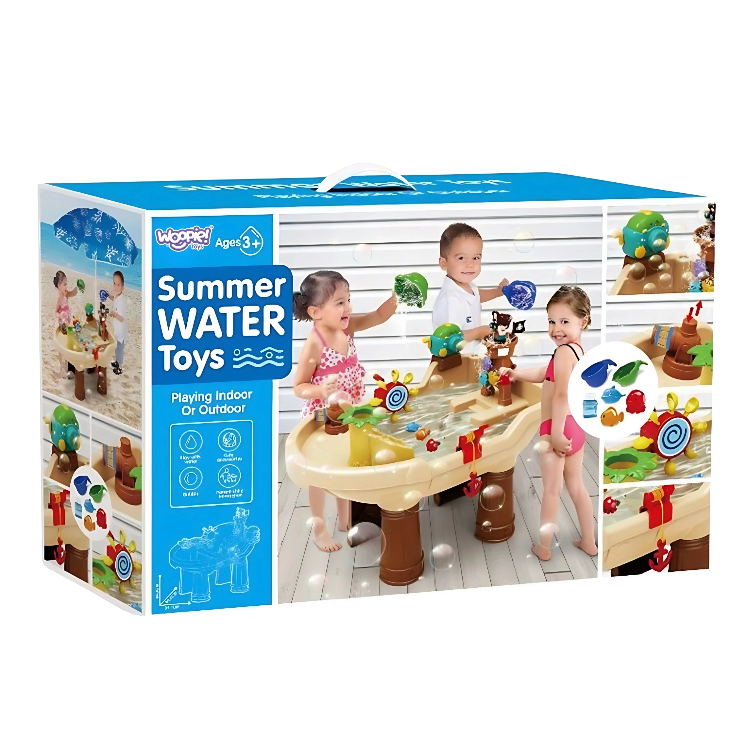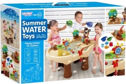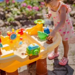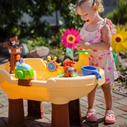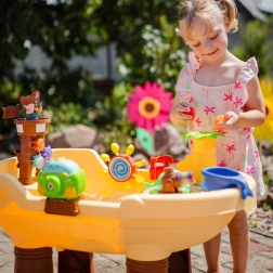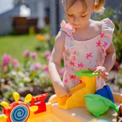 Водната и пясъчна маса Woopie във форма на пиратски кораб превръща двора в залив на приключения. Децата могат да пръскат вода от оръдието, да я пускат по пързалката, да въртят малки и големи водни колела и да духат сапунени балони. Благодарение на стабилните крака и качествената пластмаса масата е издръжлива, безопасна и подходяща за ежедневна игра.