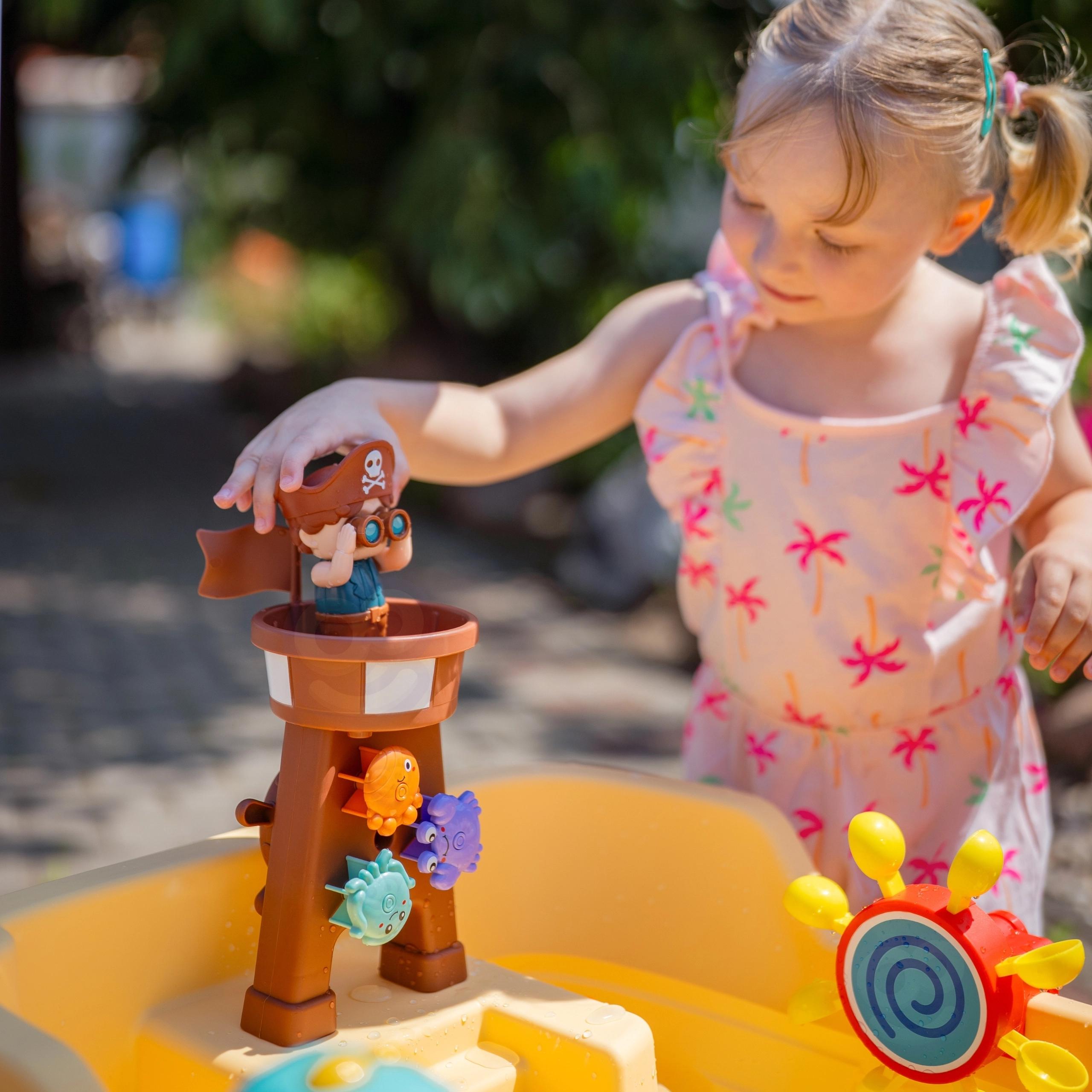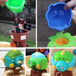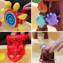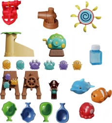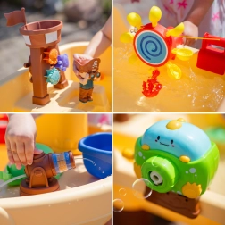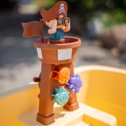 Комплектът включва пиратска кула с гнездо, фигурка пират, котва, чашки за преливане и плаващи животни, които подпомагат сетивната игра, координацията ръка–око и креативността. Голямото пространство позволява удобна съвместна игра на повече деца, а опростената конструкция улеснява източването на водата и поддръжката.