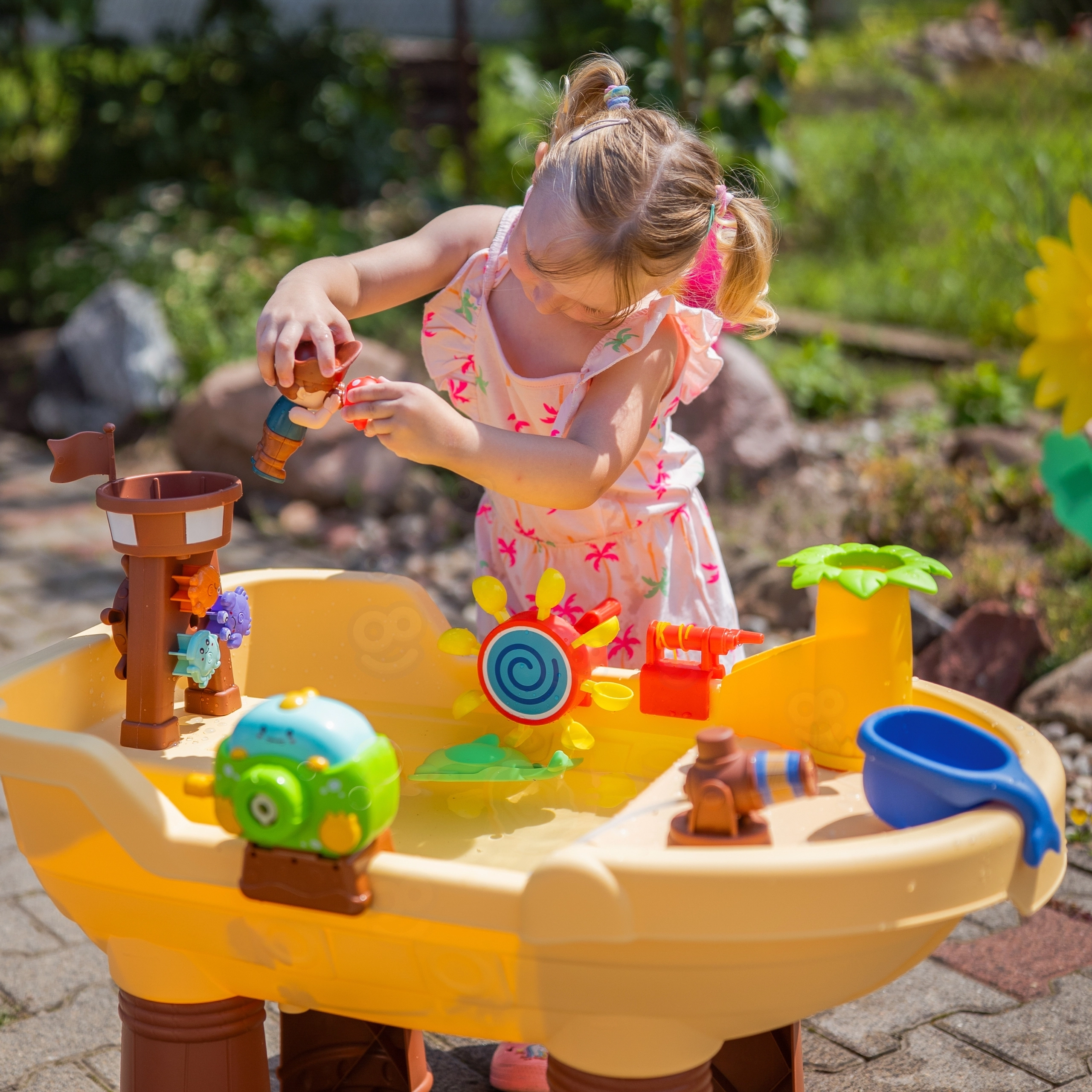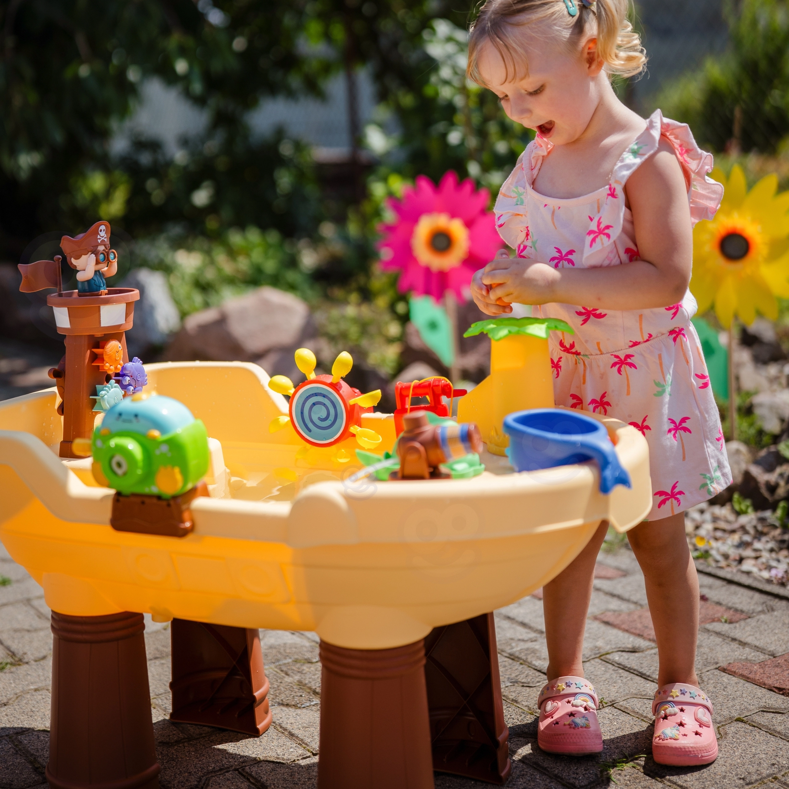 Кулата с пирата, пързалката и водните колела реагират на наливането на вода. Децата откриват причинно-следствените връзки, тренират моториката и развиват въображението.