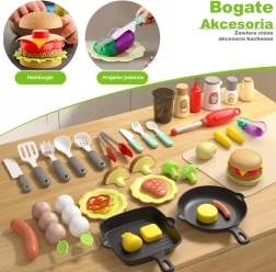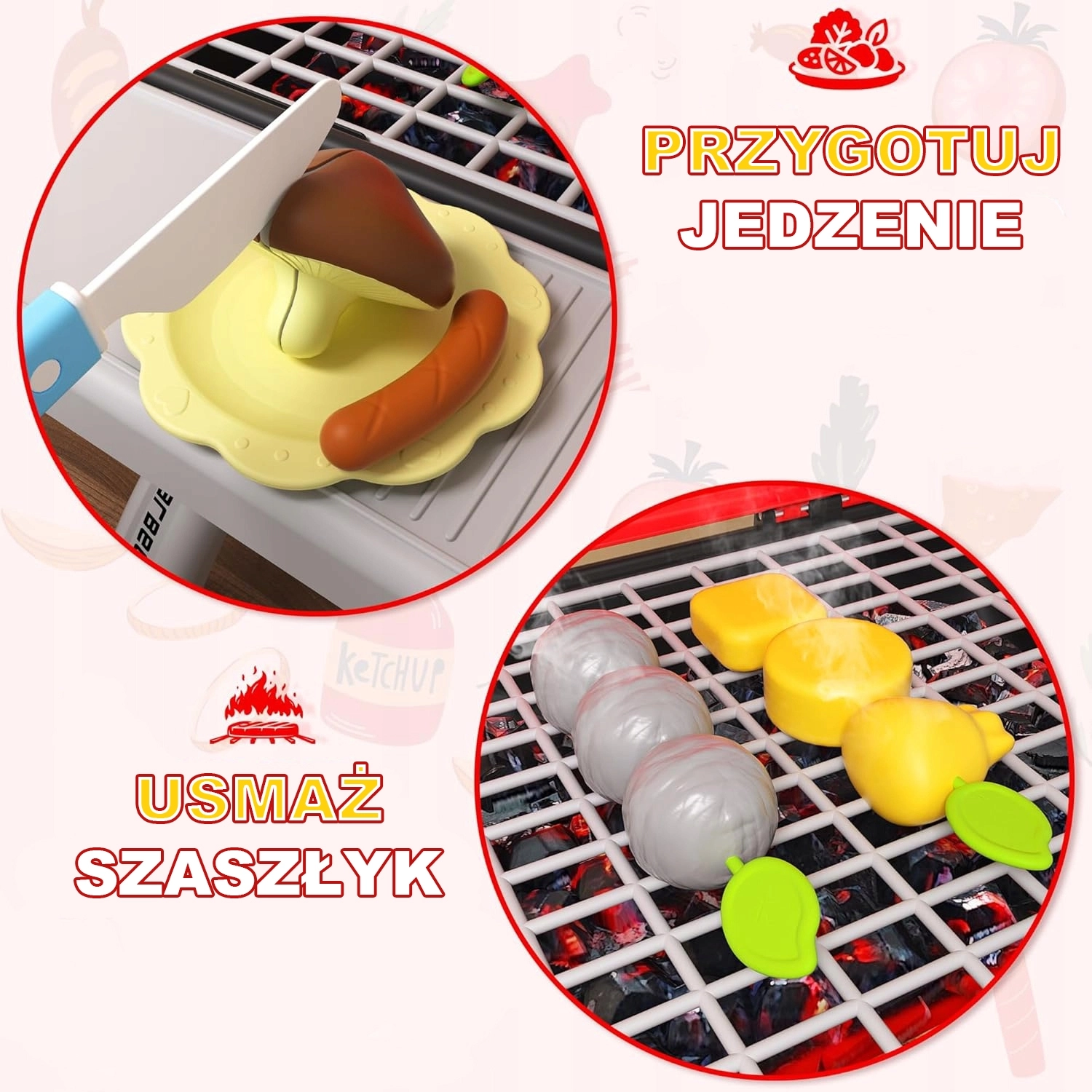 Тигани, прибори, чинии, комплект за хранене и разнообразни храни за грил стимулират въображението и развиват фината моторика.