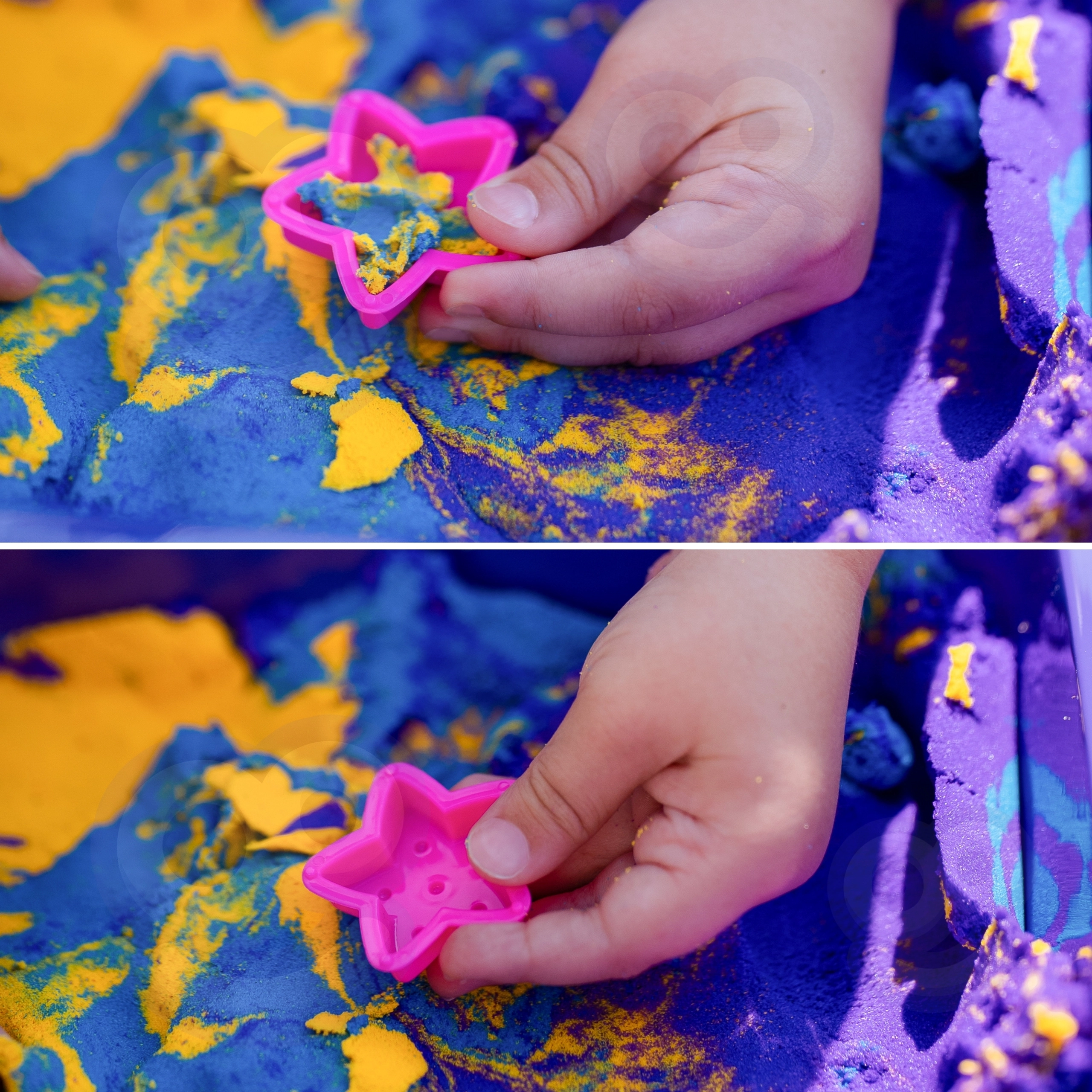 Децата могат да мачкат, режат и оформят пясъка в звездички и други мотиви. Страхотно за сетивна игра и развитие на фината моторика.