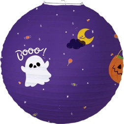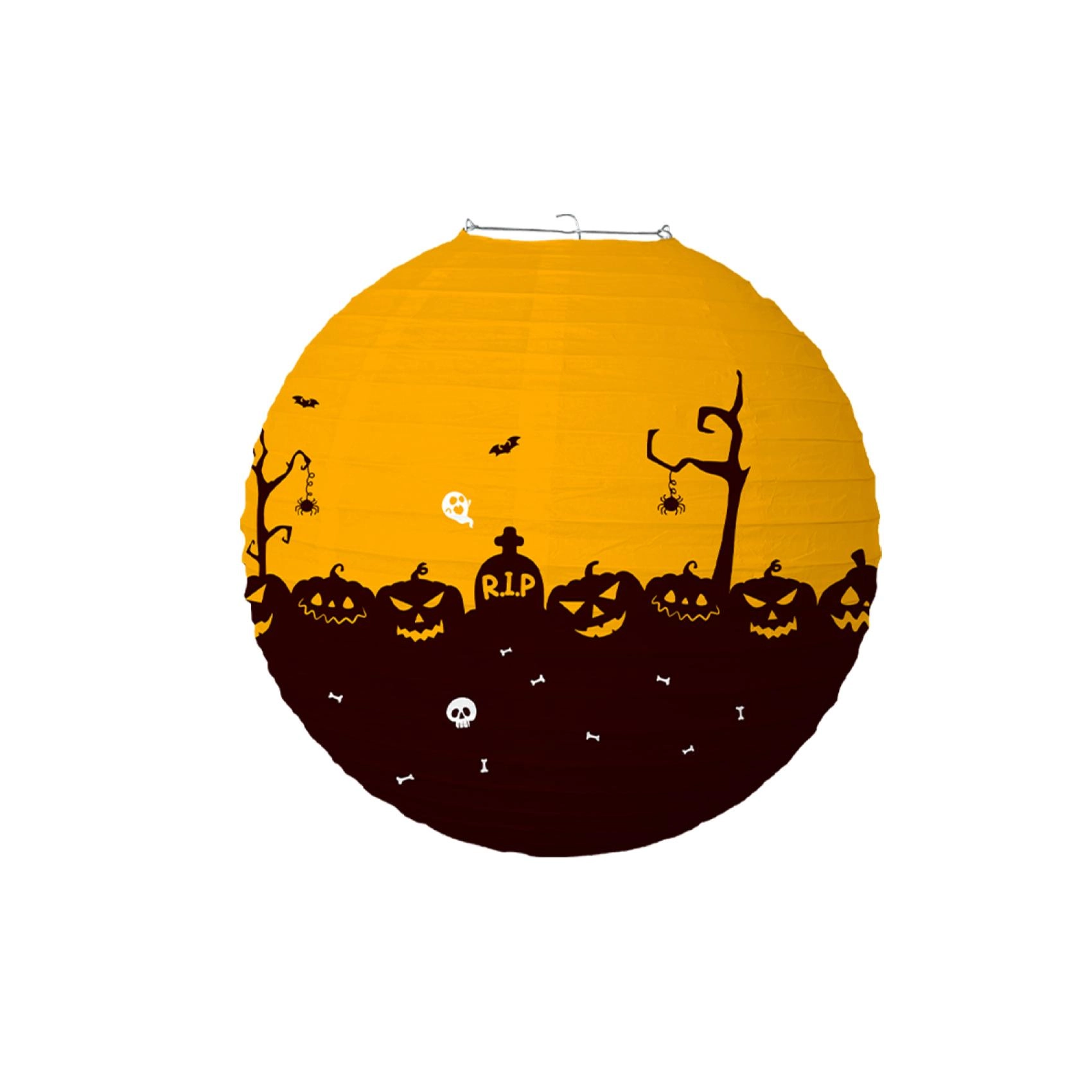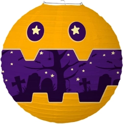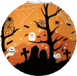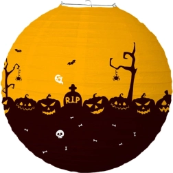 Придайте на хелоуинската си украса правилната атмосфера с кръгъл хартиен фенер с диаметър 30 см. Благодарение на леката конструкция, лесното окачване и страховитите мотиви като тикви, духове, прилепи и гробища, той мигновено създава за партита и прозорци.
