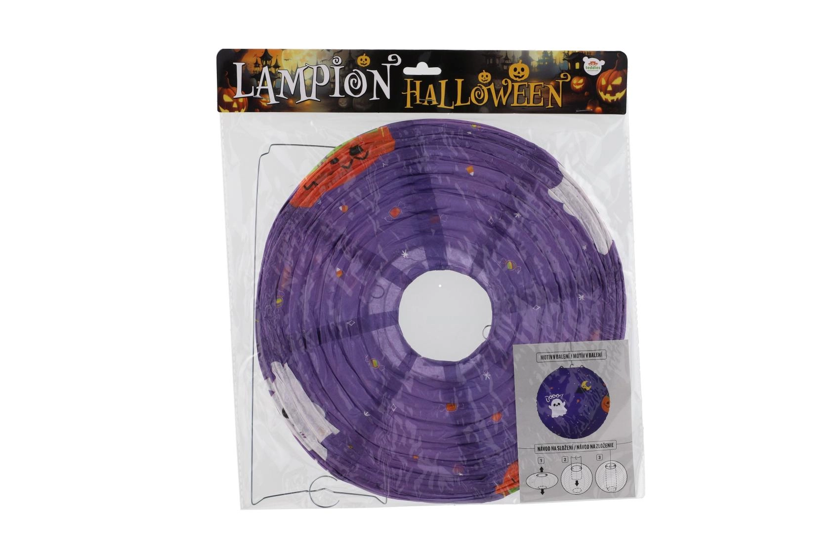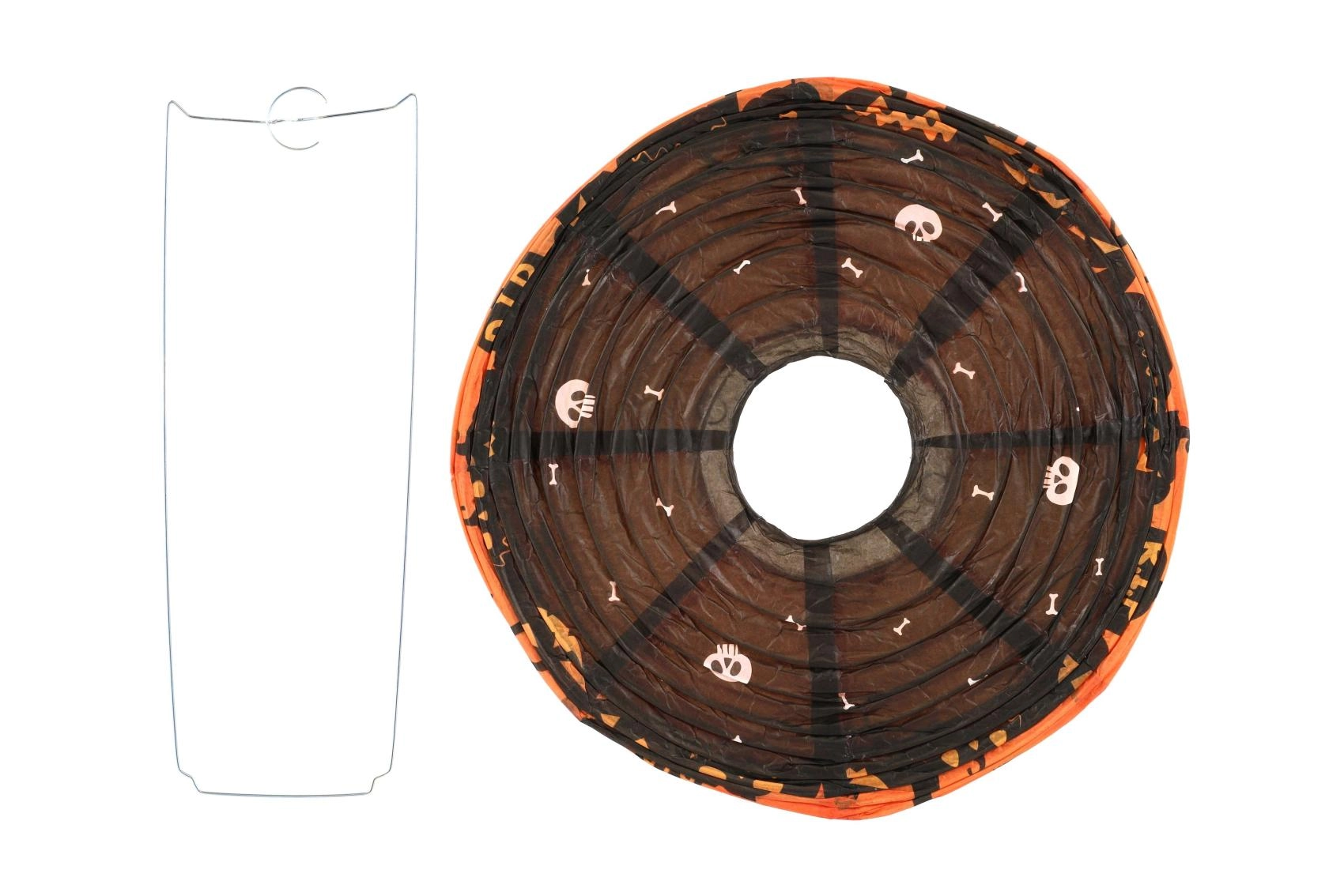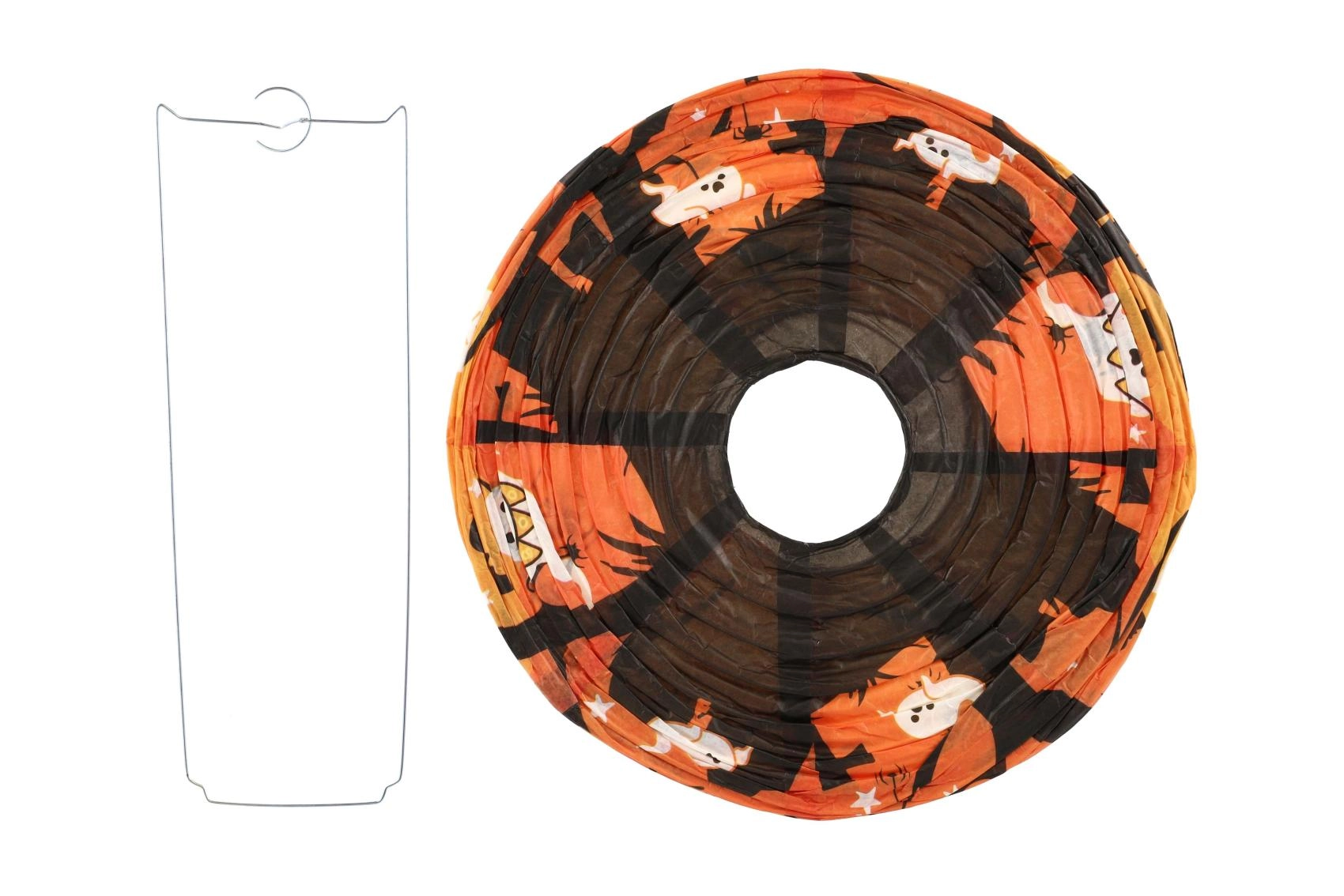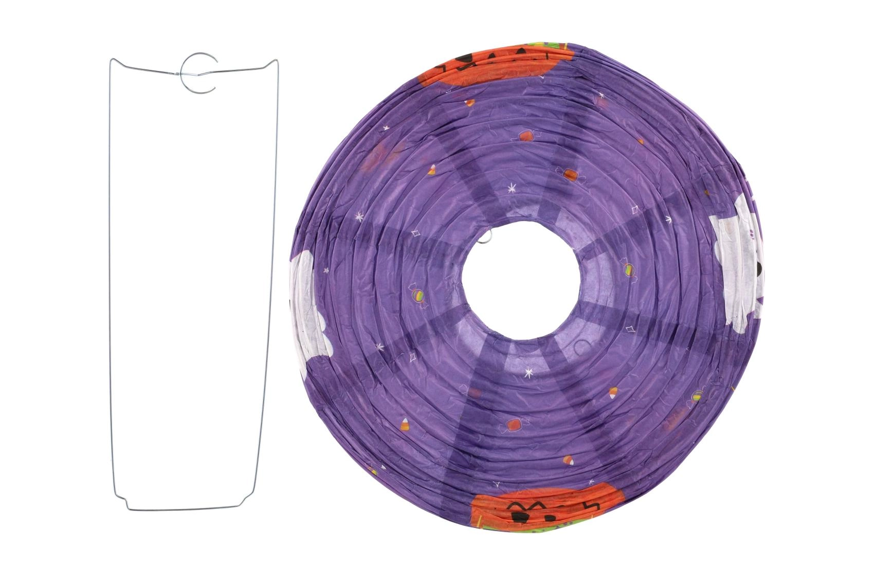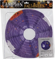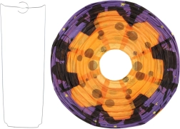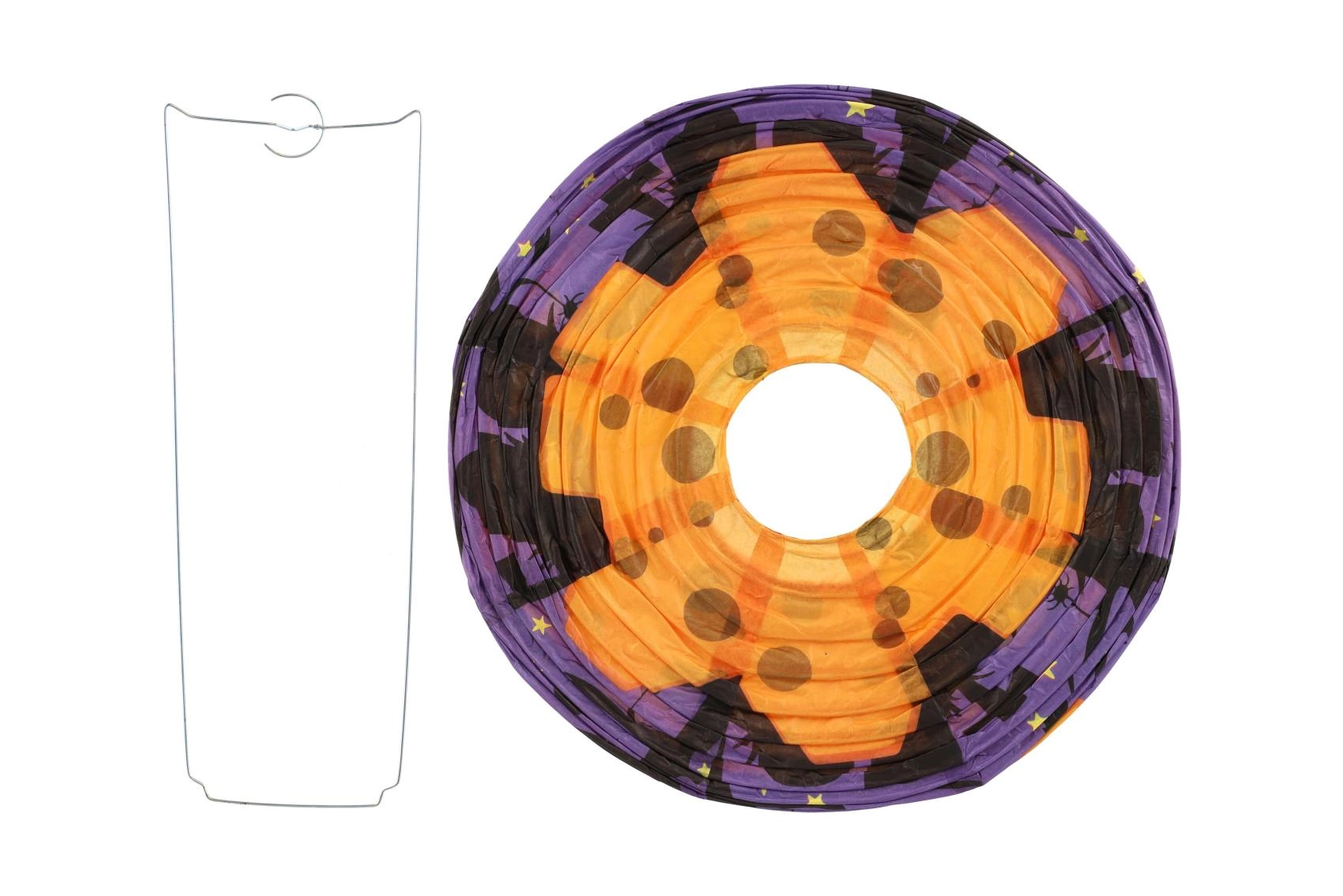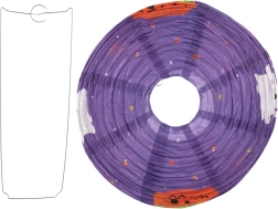 Този декоративен фенер е идеален за хелоуински партита, украса на детска стая, градина и витрини. Кръглата форма, ярките оранжеви и лилави тонове и познатите хелоуински мотиви осигуряват незабавен ефект. Благодарение на металната кука и вътрешната рамка се сглобява и окачва лесно.