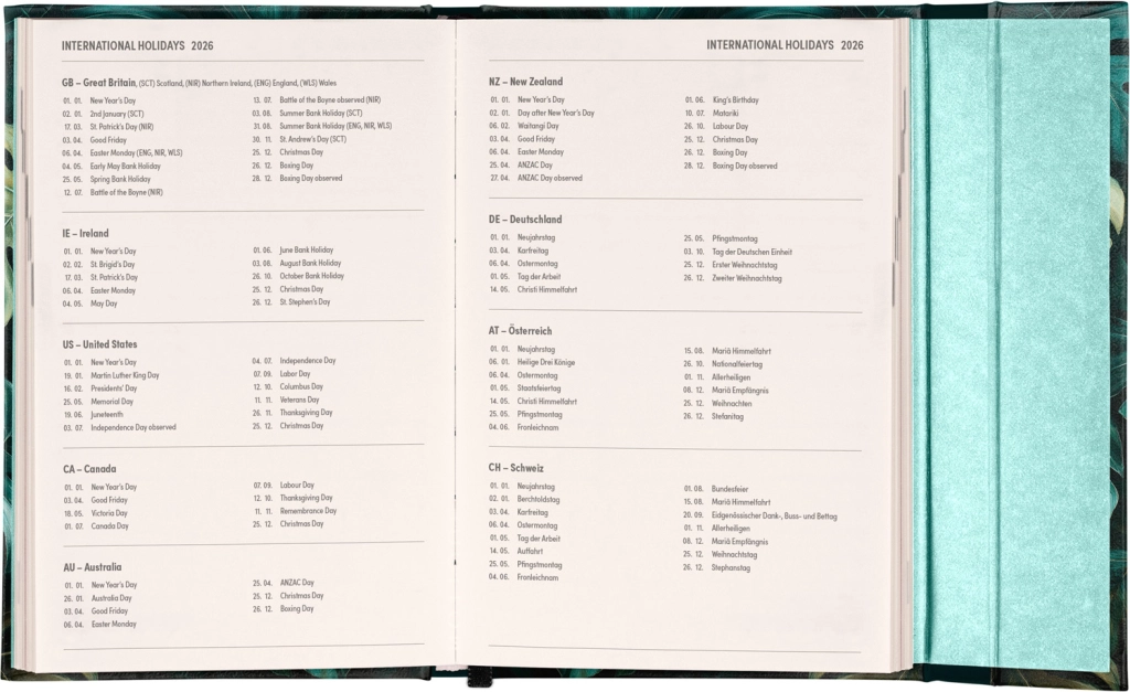 Седмичен дневник с магнитно закопчаване и текстове на английски език е отличен избор за тези, които искат да имат плановете си ясно под контрол. Разпределението на седмицата на две страници и международните празници осигуряват комфортна основа за ежедневното планиране.