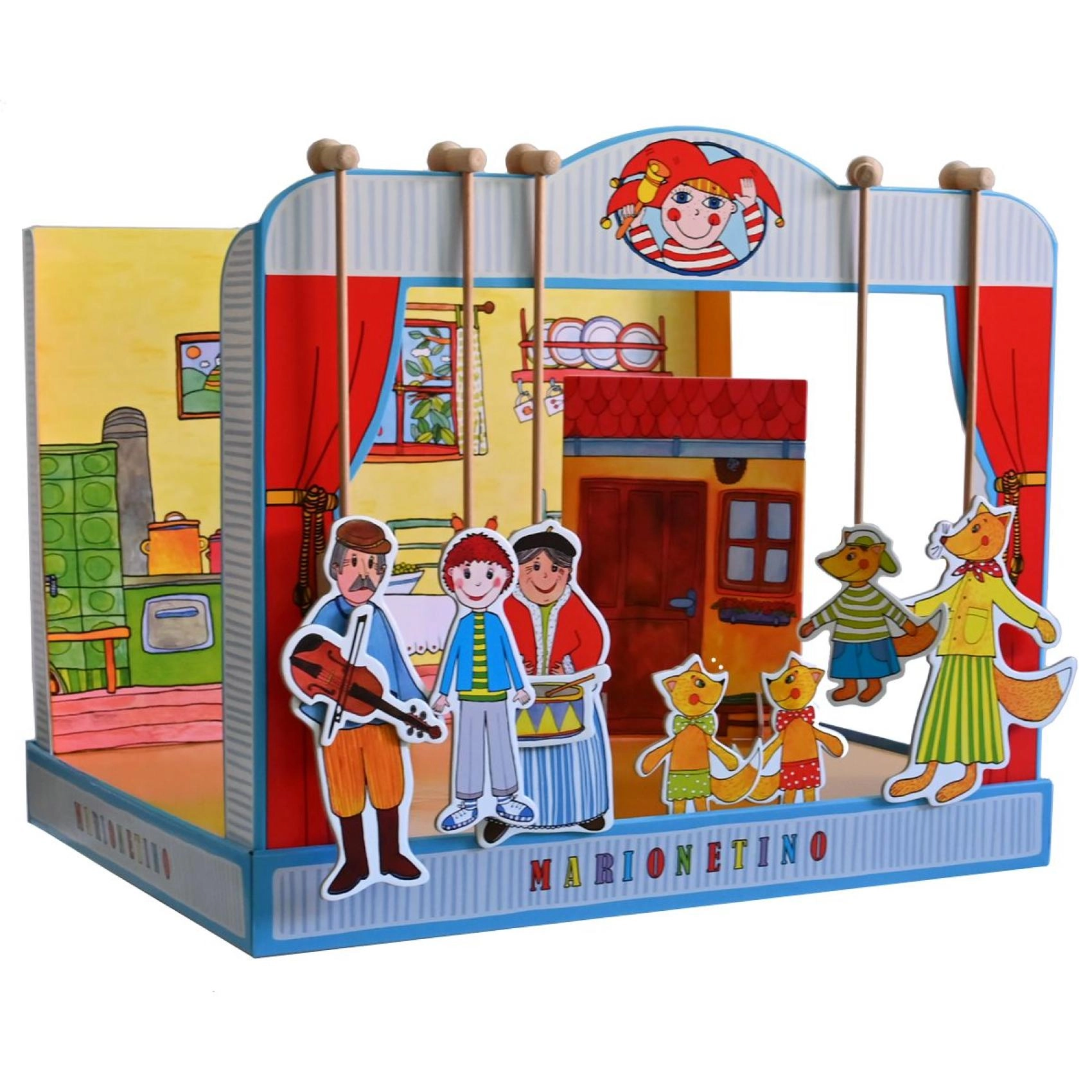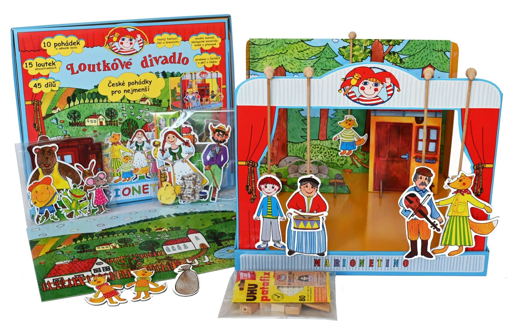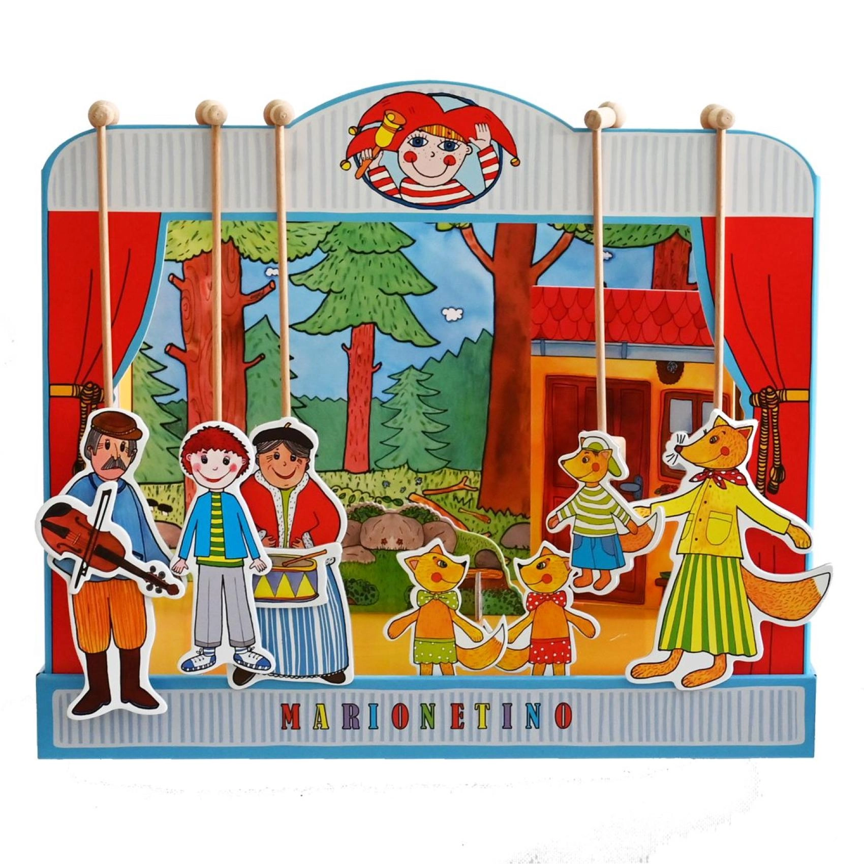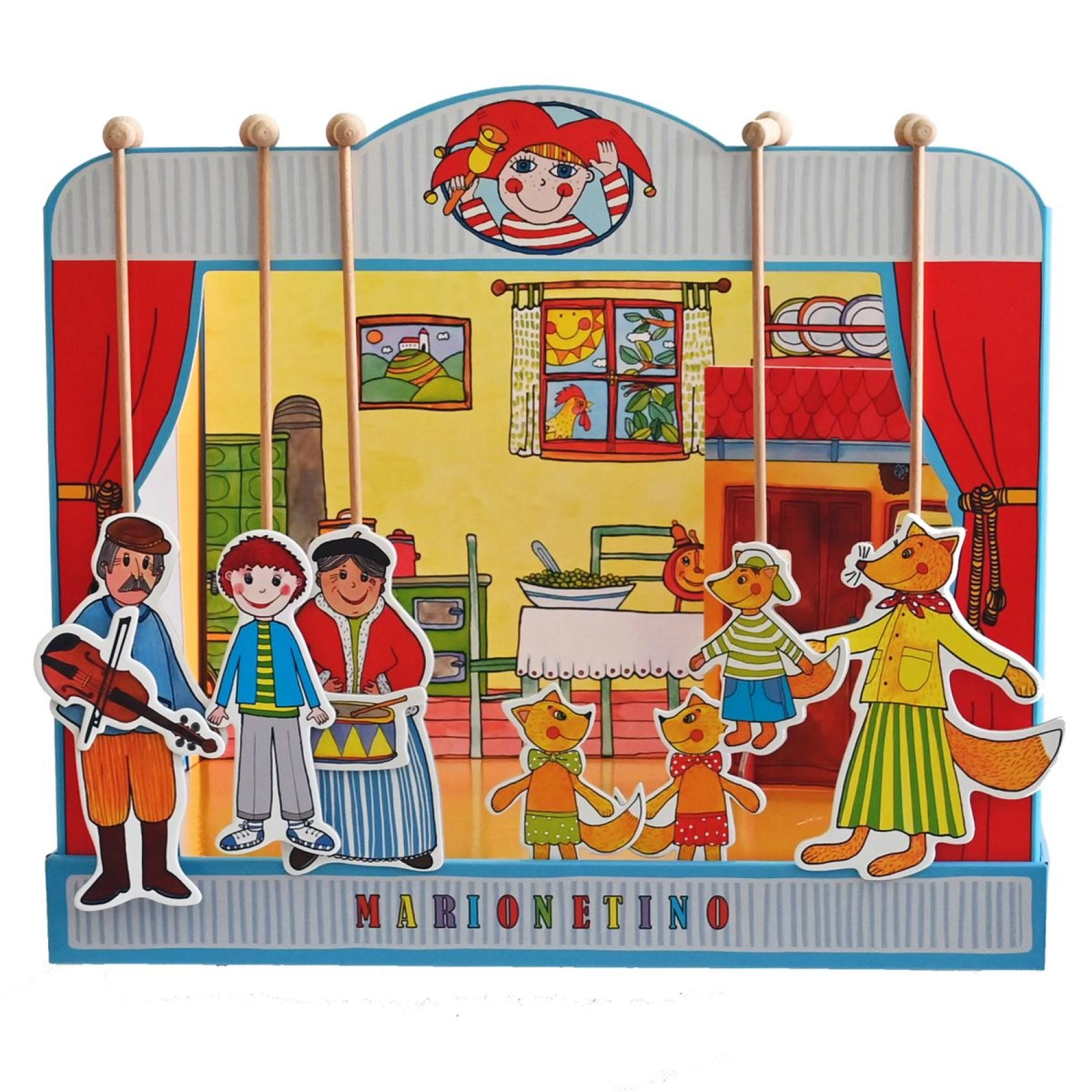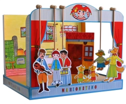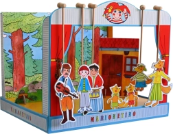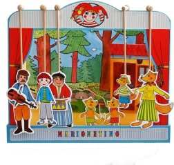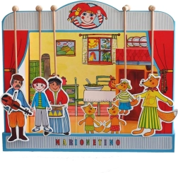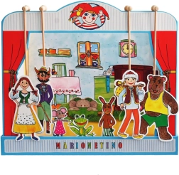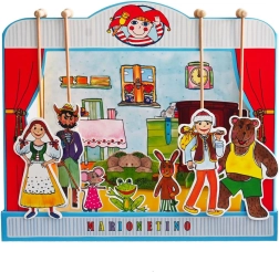 Комплектът е изработен от качествена книговезка мукава, дърво и ламиниран картон, което гарантира неговата издръжливост и дълъг живот. Идеален е както за по-малки деца, които тепърва се запознават с театралното изкуство, така и за забавление на цялото семейство.