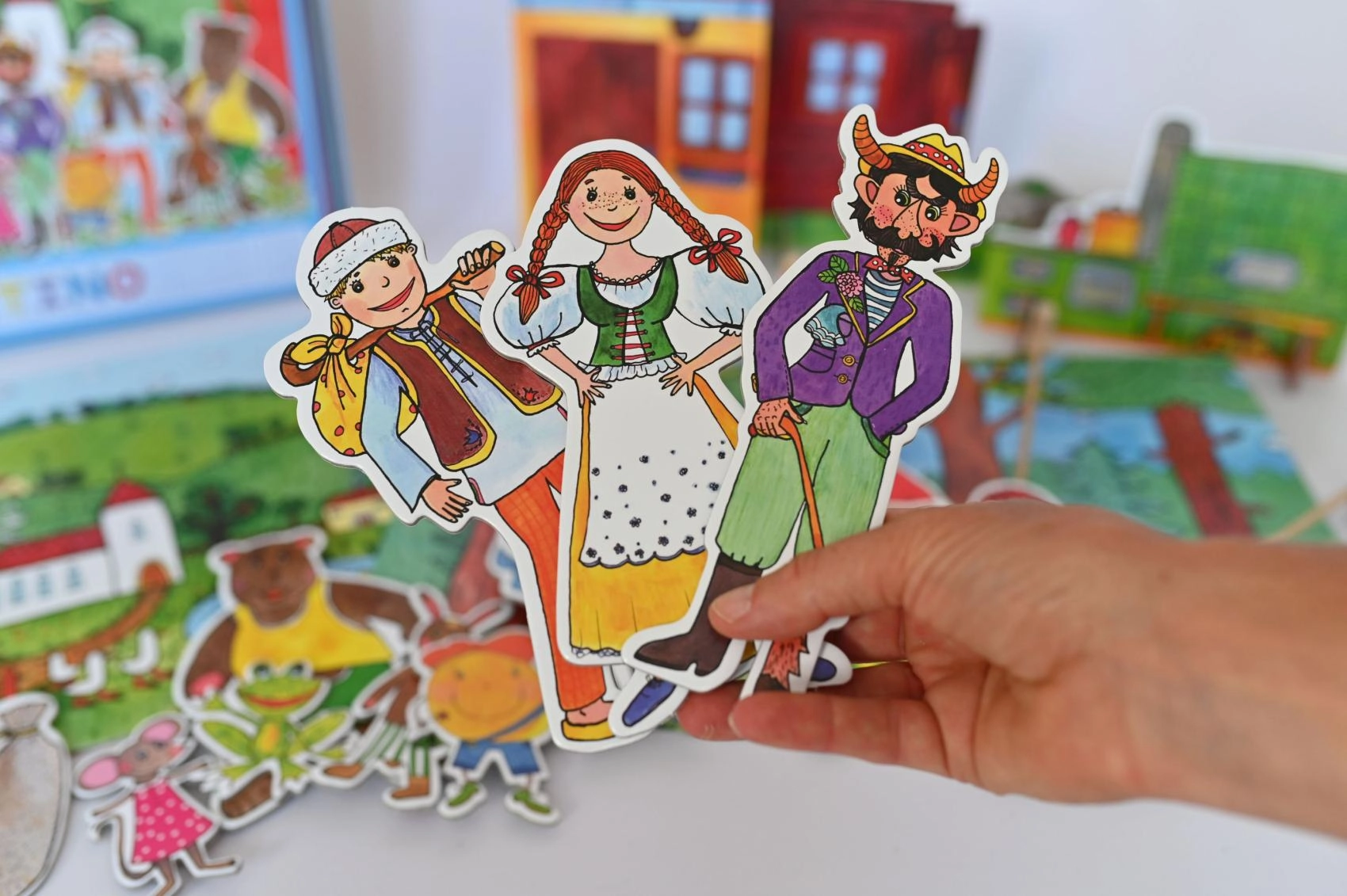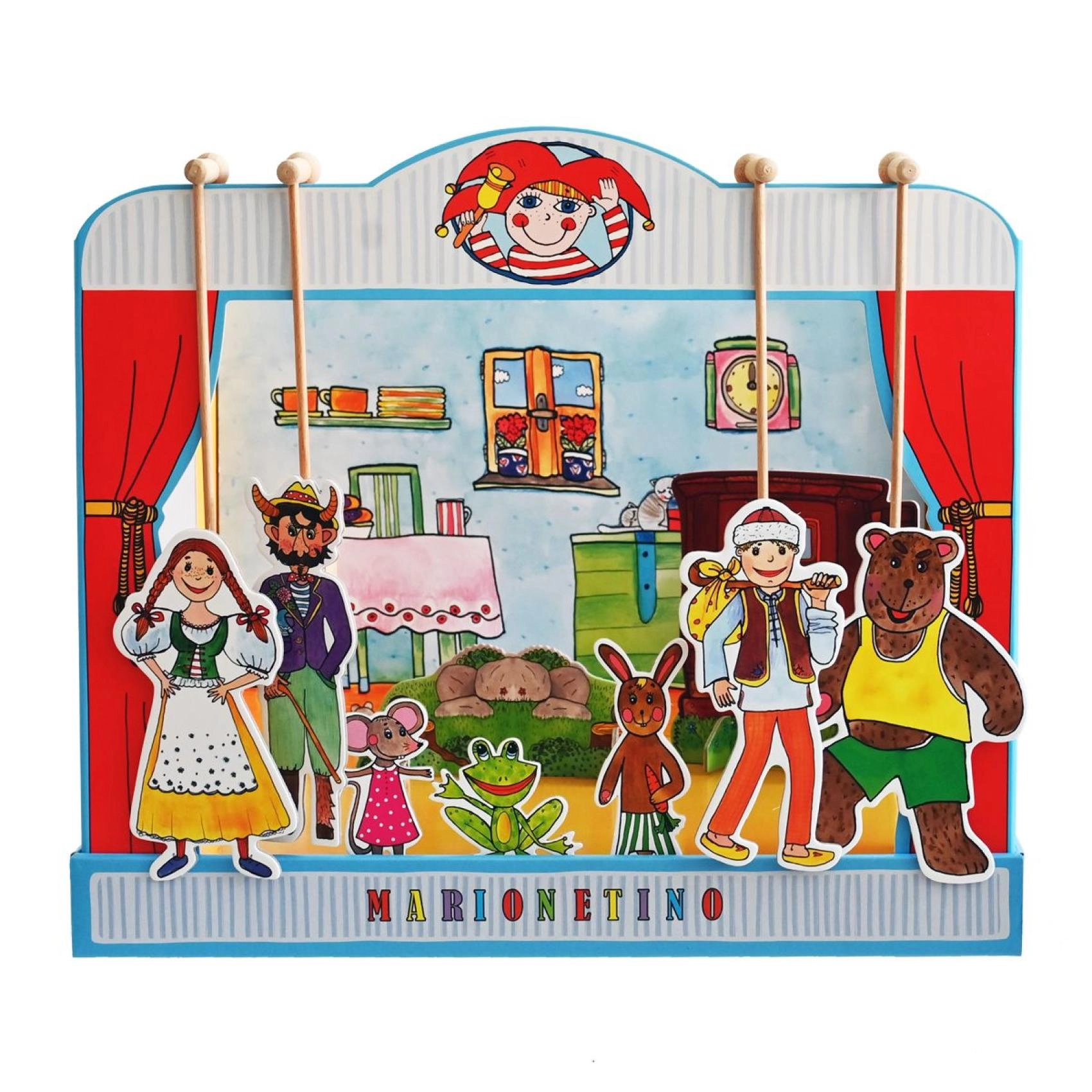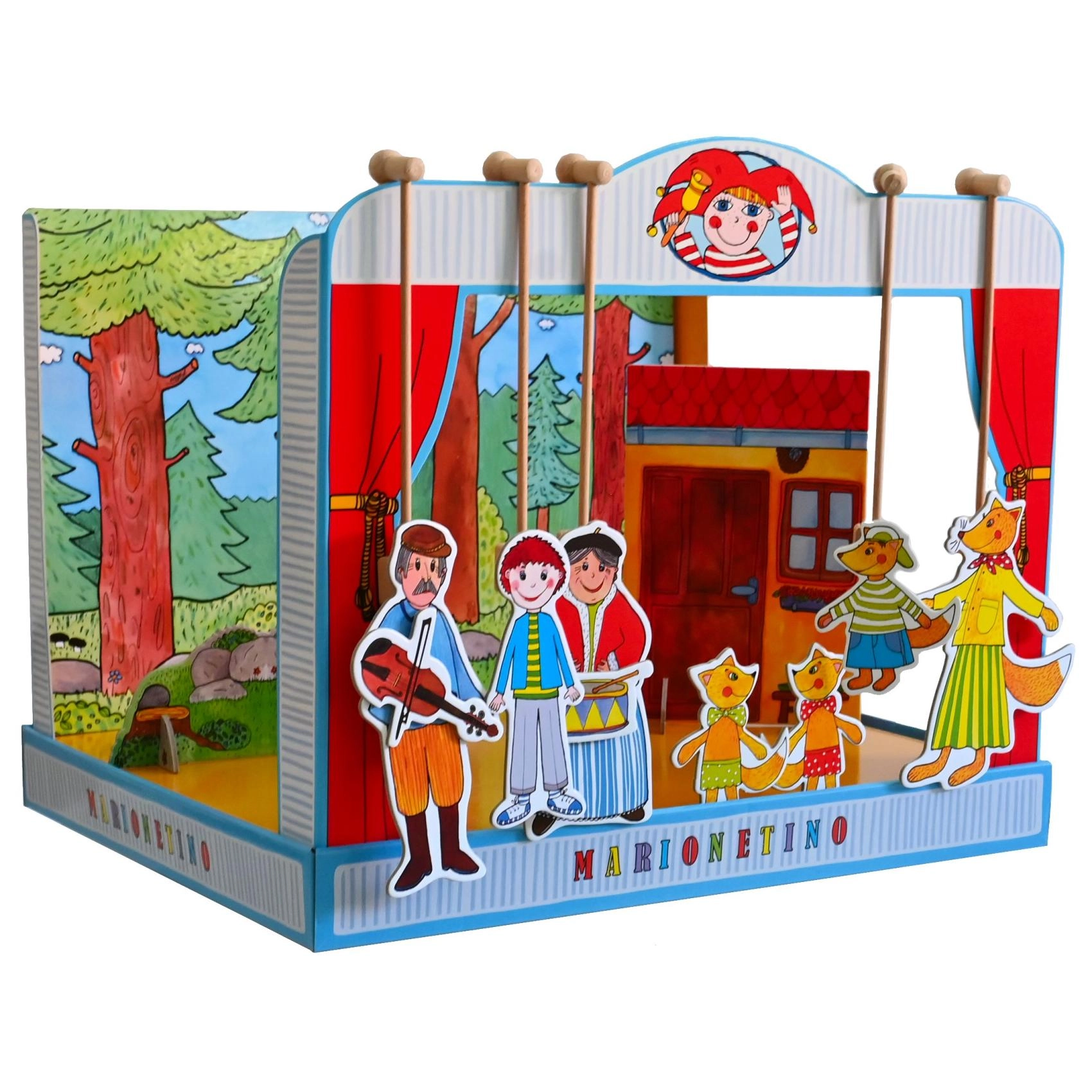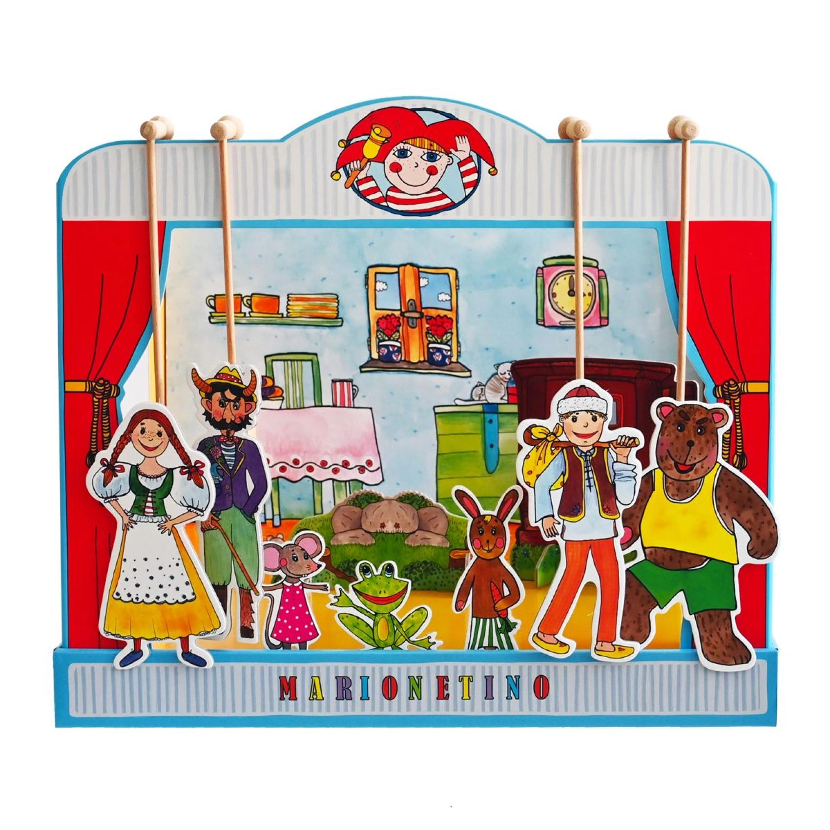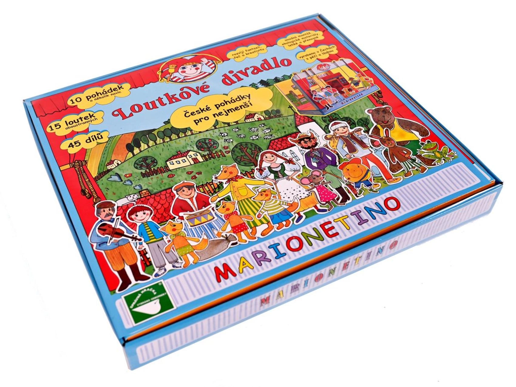 Комплектът е изработен от качествена книговезка мукава, дърво и ламиниран картон, което гарантира неговата издръжливост и дълъг живот. Идеален е както за по-малки деца, които тепърва се запознават с театралното изкуство, така и за забавление на цялото семейство.