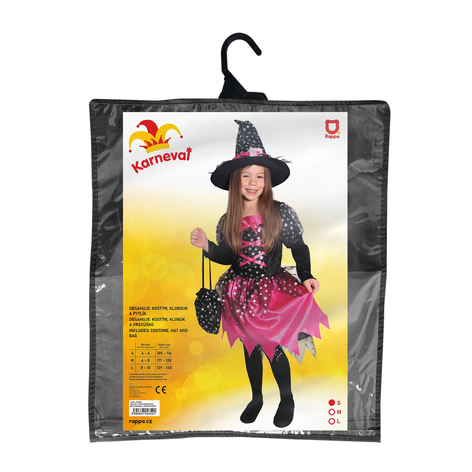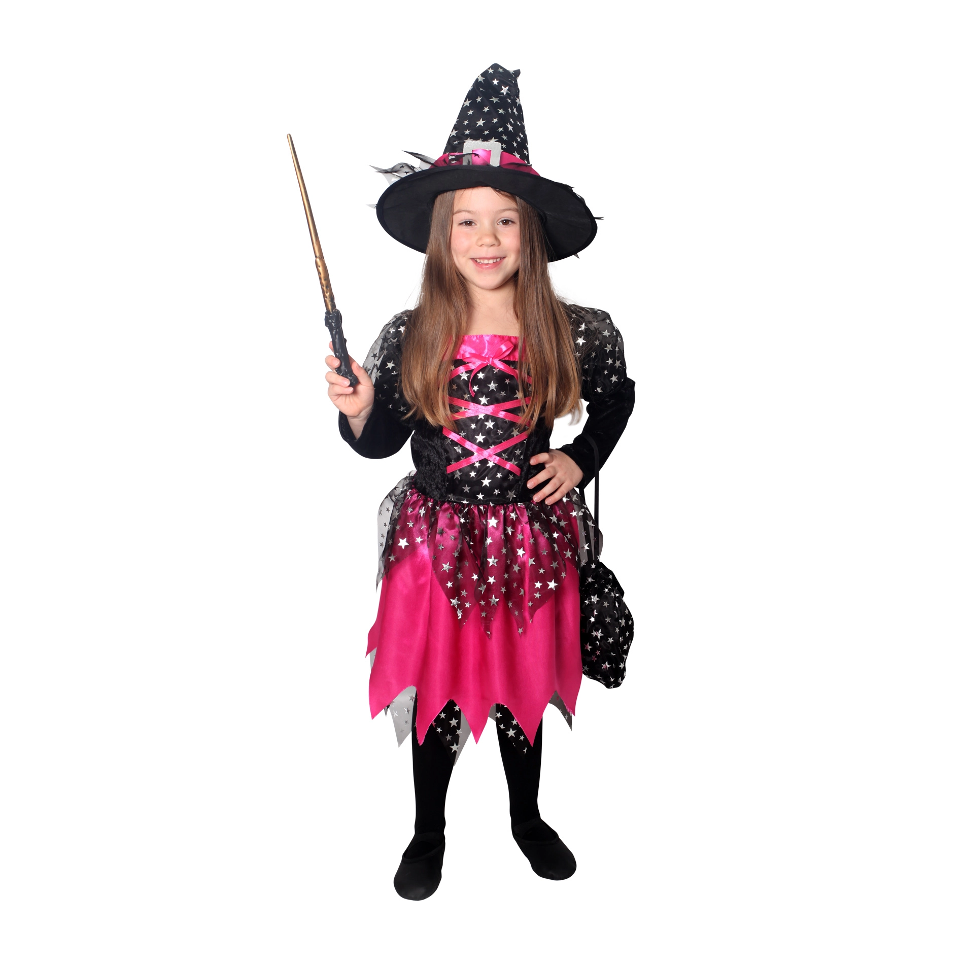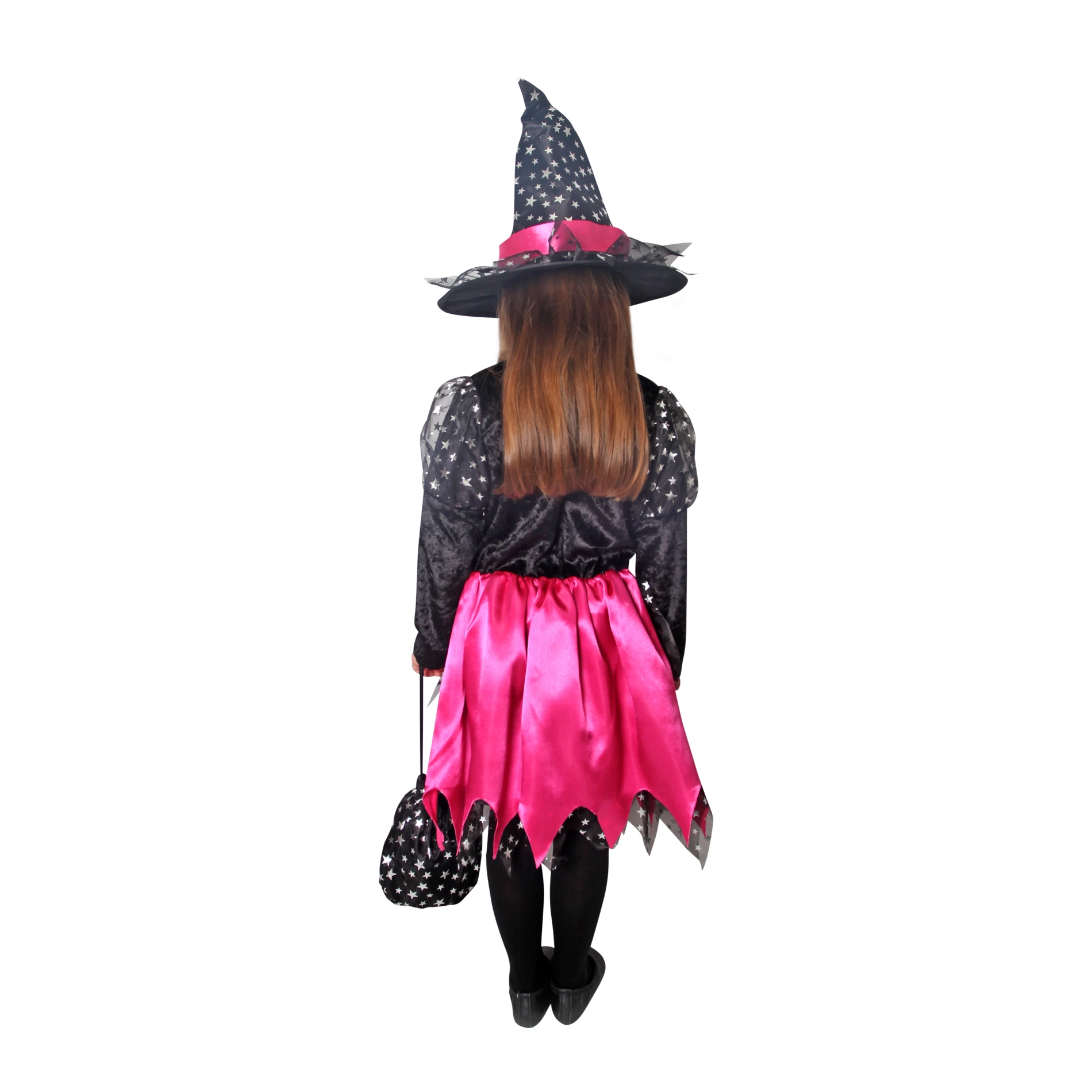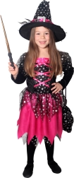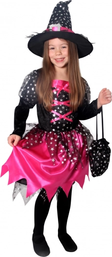 Магически костюм за малки вещици! Този черно-розов костюм е идеален за момиченца на възраст от 4 до 6 години, украсен с розови панделки и сребърни звездички.