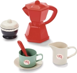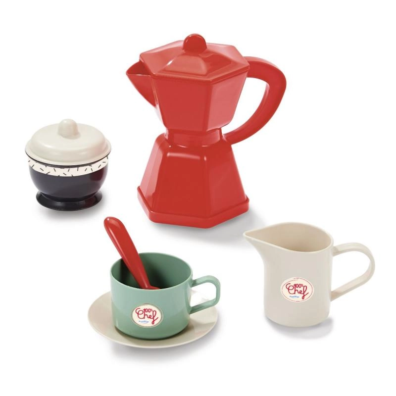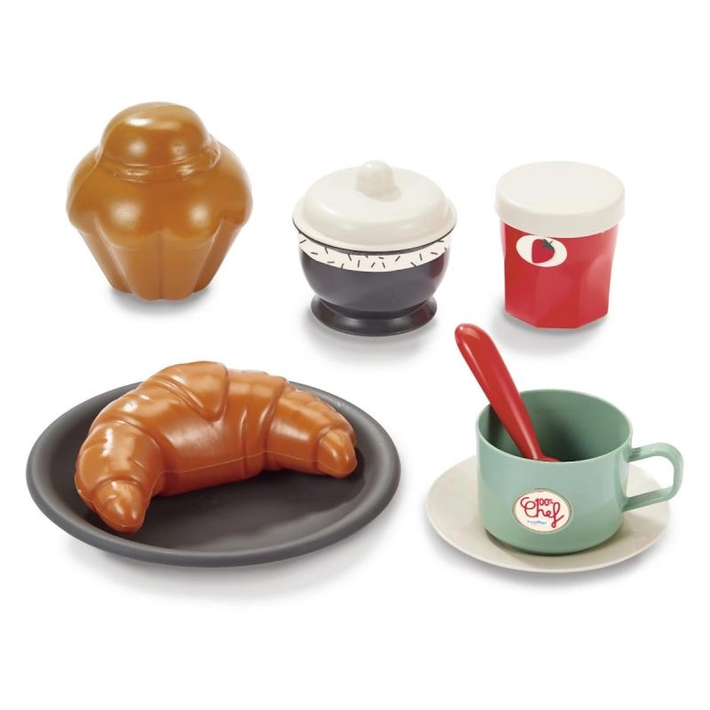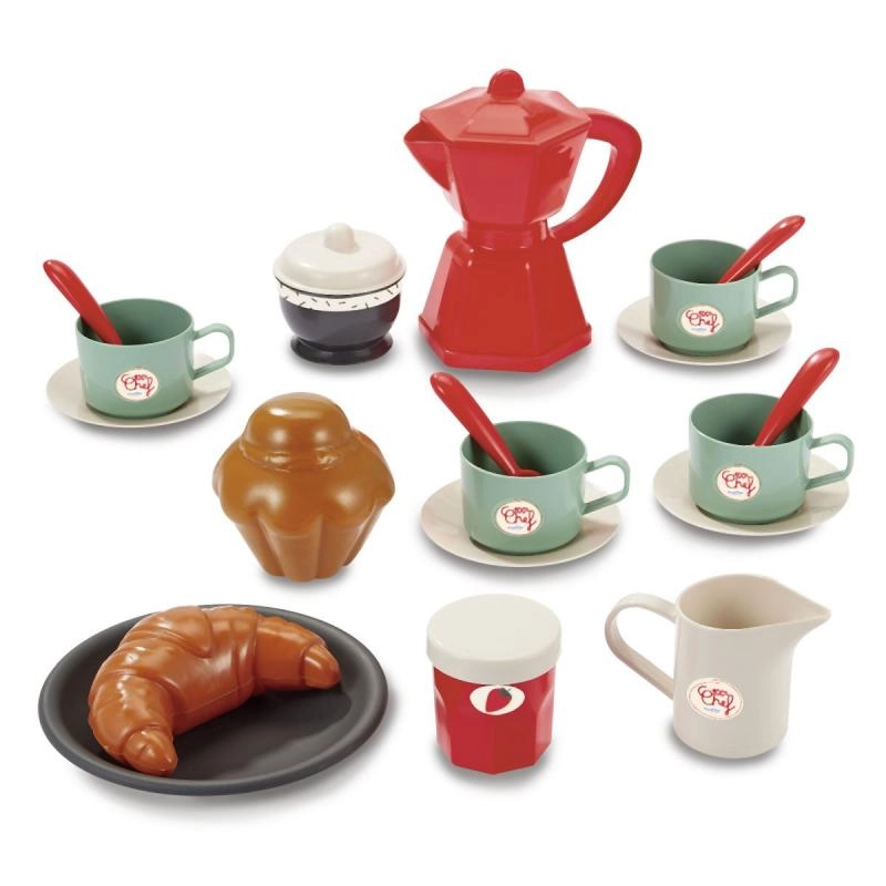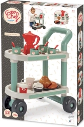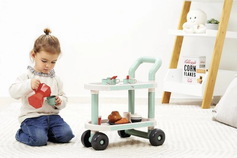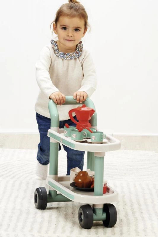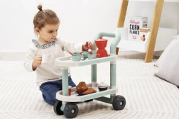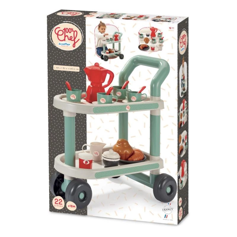 Представяме закуска на колелца с аксесоари, идеална за малки баристи и пекари. Този сет съдържа общо 22 части, които осигуряват всичко необходимо за перфектна предобедна закуска. Количката е на колелца, което гарантира лесно преместване из стаята или в двора.