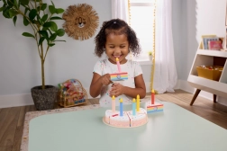 Този страхотен комплект включва всичко необходимо на децата за създаване на собствена торта. Всички части са изработени от сертифицирана дървесина от Forest Stewardship Council (FSC) и са боядисани с нетоксични бои на водна основа.