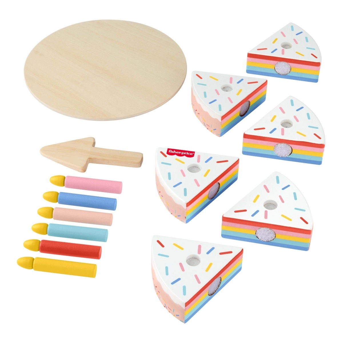 Правете всеки ден празник с тази дървена торта за рожден ден от Fisher-Price. Комплектът съдържа 6 парчета торта, 6 свещички, поднос и нож за торта, което носи на децата часове забавление при декориране, рязане и сервиране.