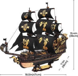 Детайлен модел на военен кораб с черно-златни платна и богати орнаменти. Всеки елемент е прецизно изработен, за да изпъква и да придава реалистична визия на модела.