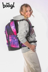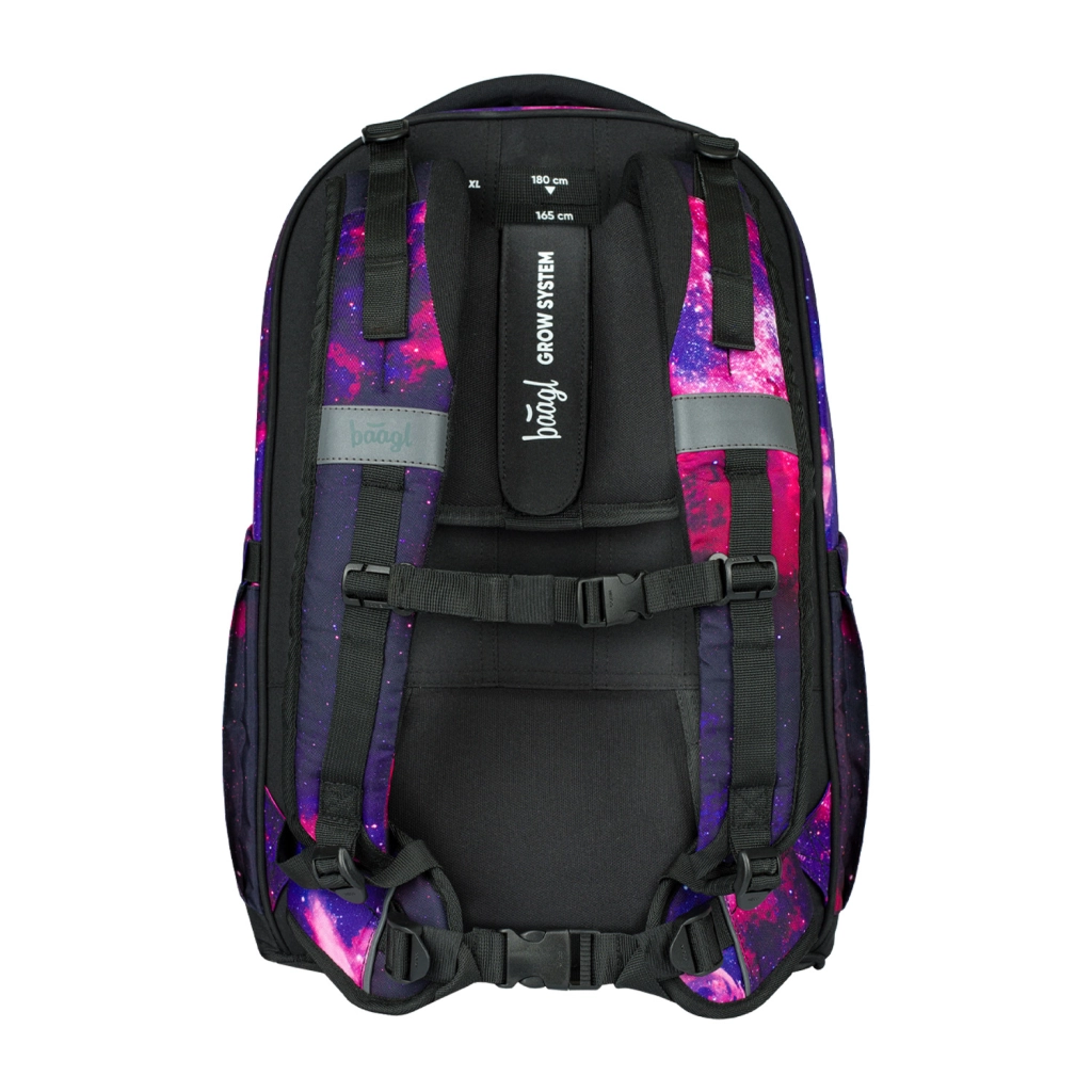Училищната раница BAAGL Skate max Galaxy е идеална за ученици и студенти с ръст между 155 и 185 см. Гърбът на раницата разполага с плъзгаща се задна система, позволяваща настройка в до четири различни размера. Благодарение на материала от рециклиран, водоустойчив текстил и светлоотразителните елементи раницата е много безопасна и устойчива.