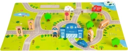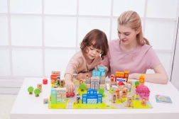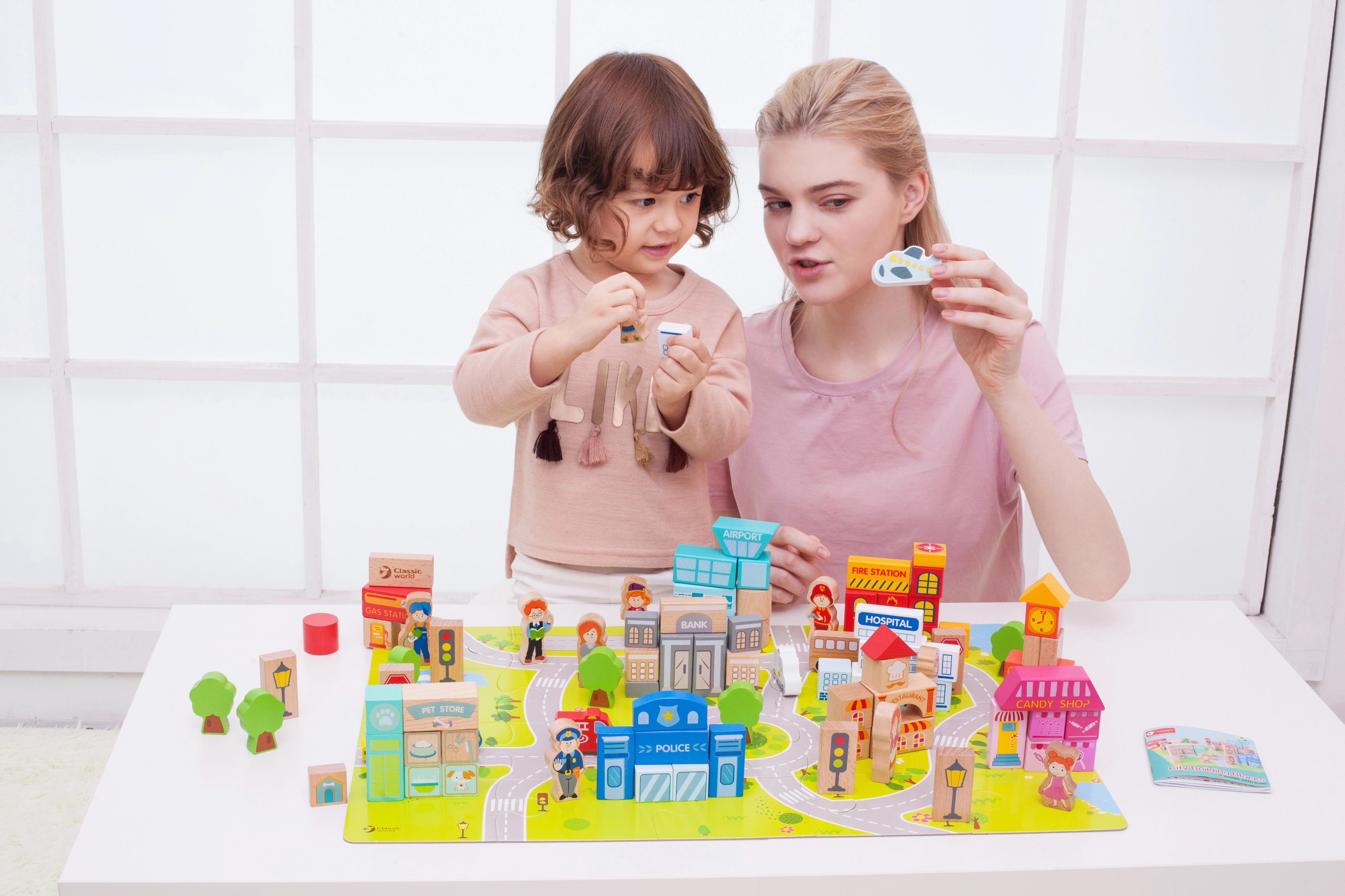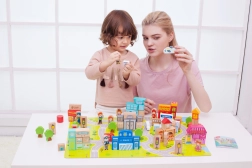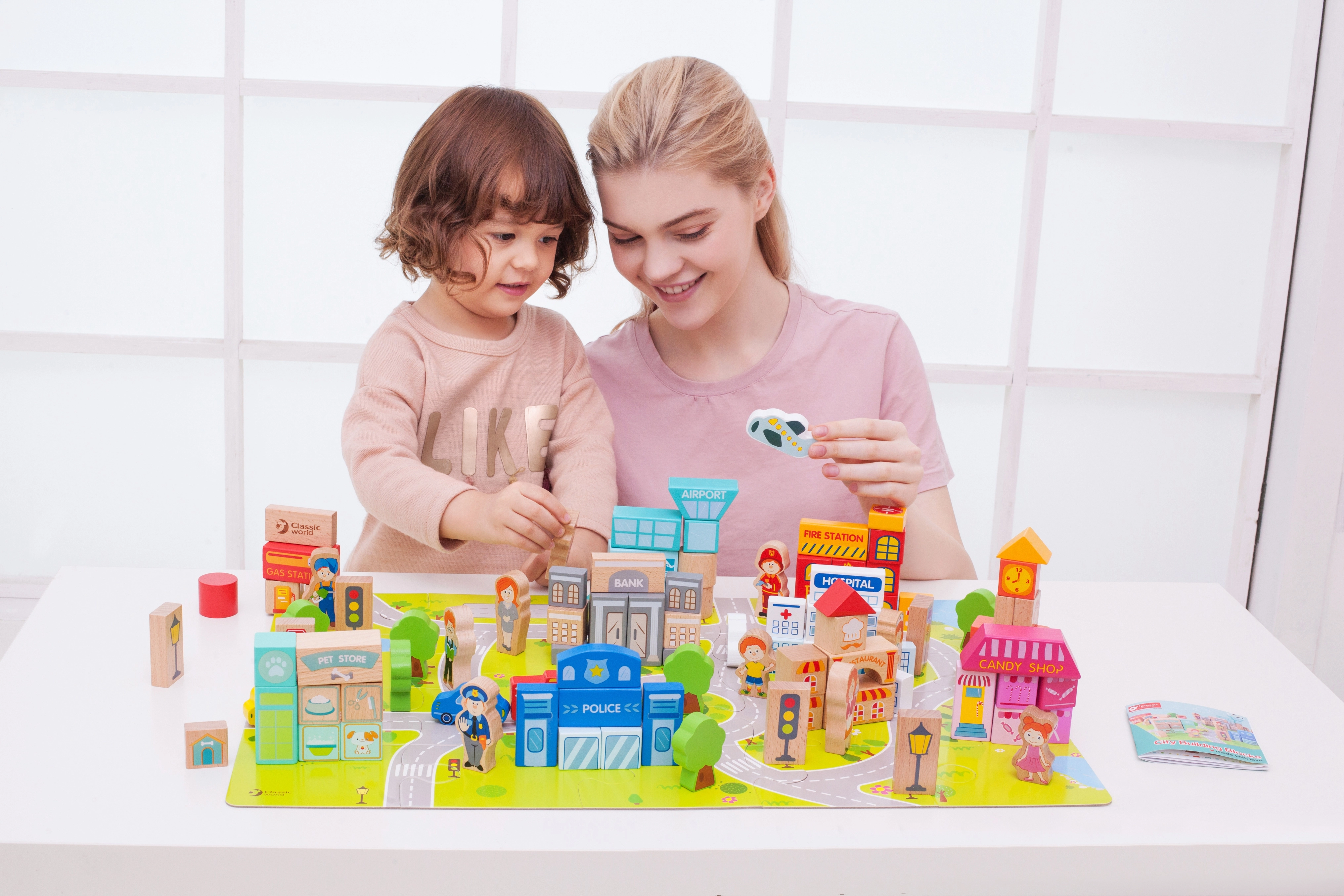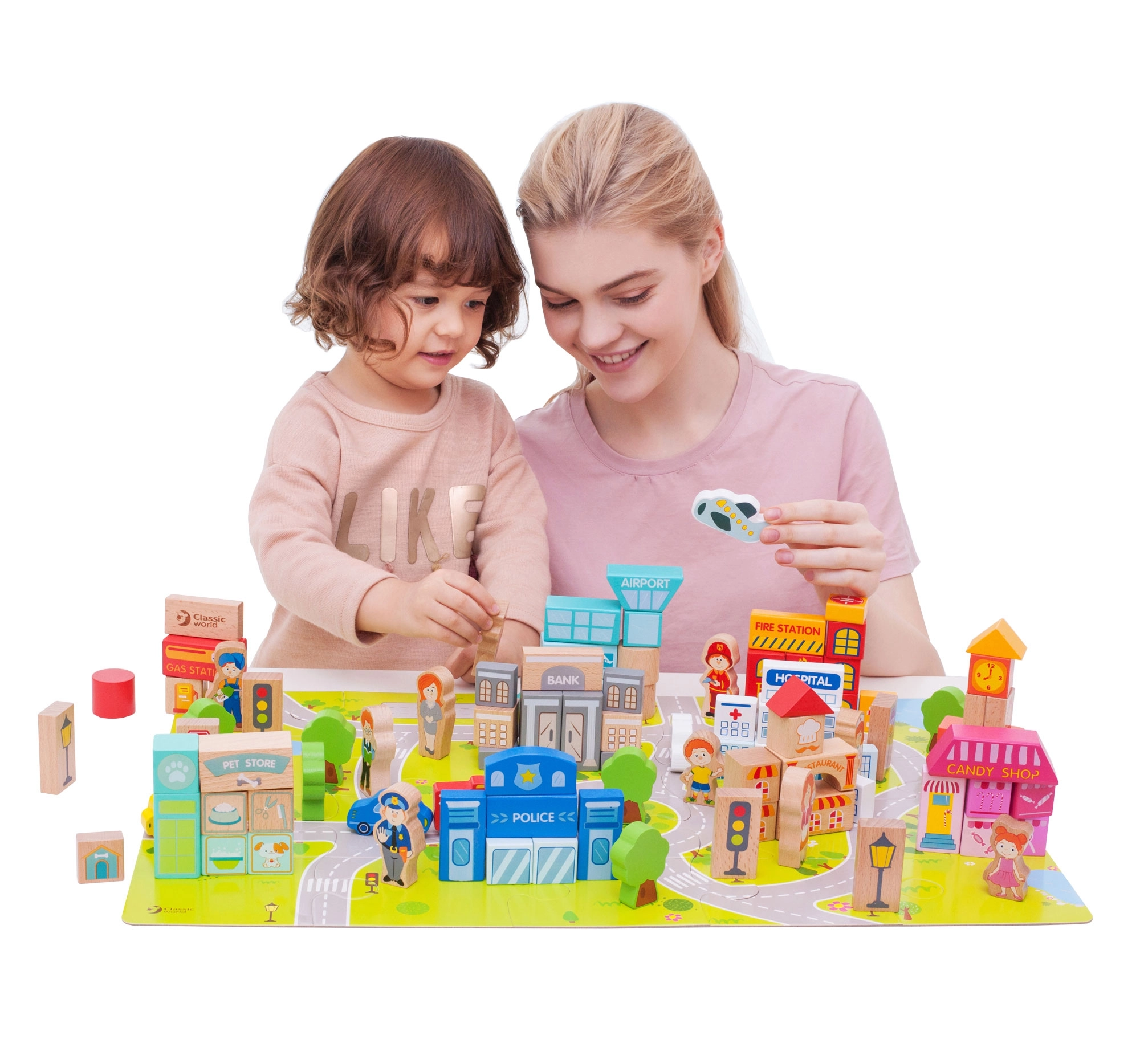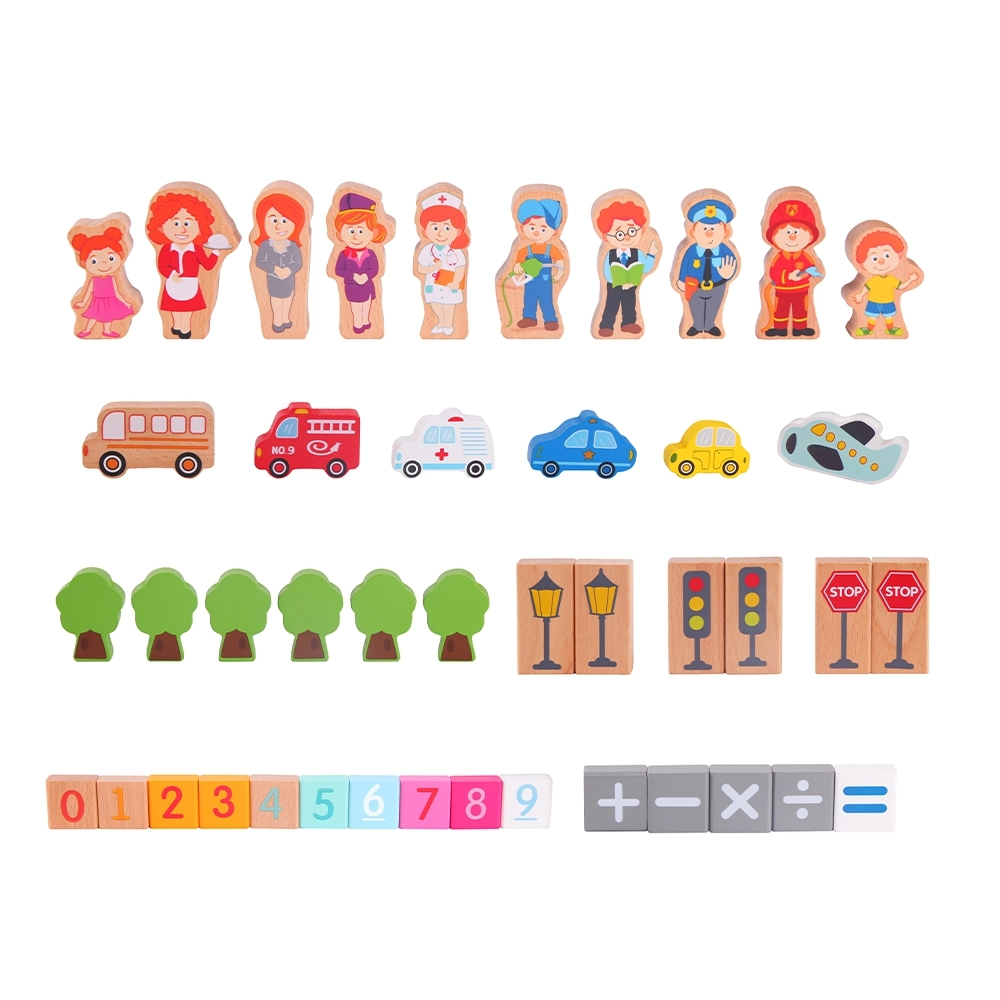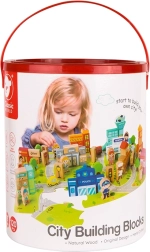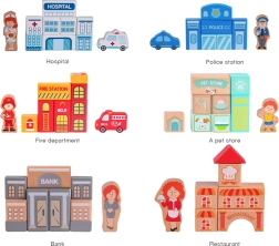 С този комплект децата могат да строят типични градски сгради като училище, полицейски участък, пожарна, летище, болница, банка, ресторант, зоомагазин и други. Играчката е изработена от естествени, биоразградими и хипоалергенни материали, което гарантира максимална безопасност.
