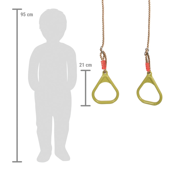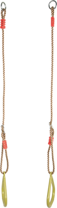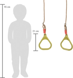 Повдигнете детските граници на забавлението до максимум с гимнастически халки. Тези халки са с размер, подходящ и за по-малки деца, което им позволява безопасно да тренират най-смелите акробатични трикове. Въжетата се регулират лесно по височина и в краищата имат метални рингове за лесно окачване.