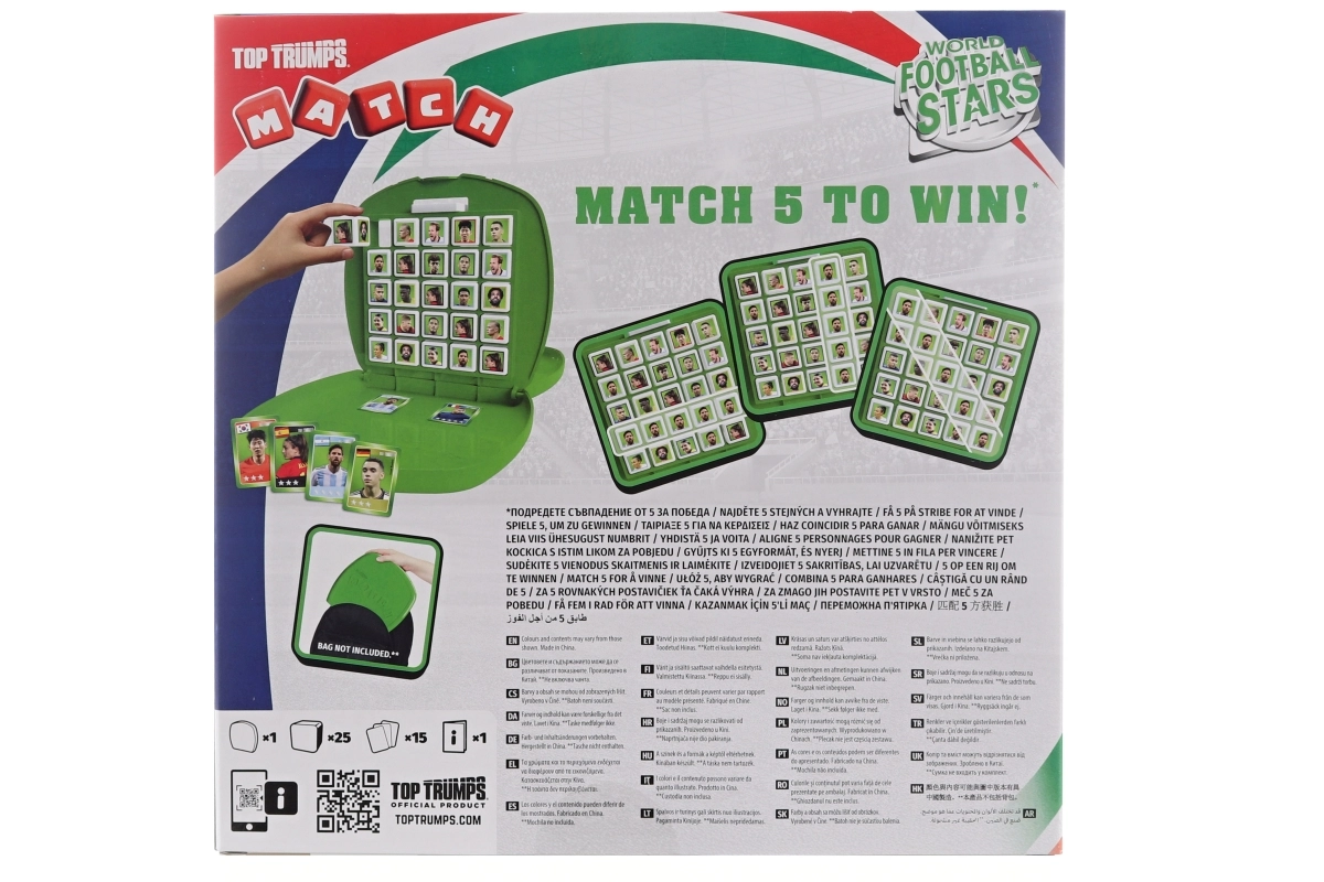 Match World Football Stars е завладяваща стратегическа игра, вдъхновена от света на футбола. Играчите се редуват да избутват кубчета от решетката и се стремят възможно най-бързо да подредят пет еднакви символа във вертикална, хоризонтална или диагонална линия. Щом успеете, извиквате „MATCH“ – но внимавайте, противникът може да ви отнеме победата, ако има съответната карта с дадения персонаж!