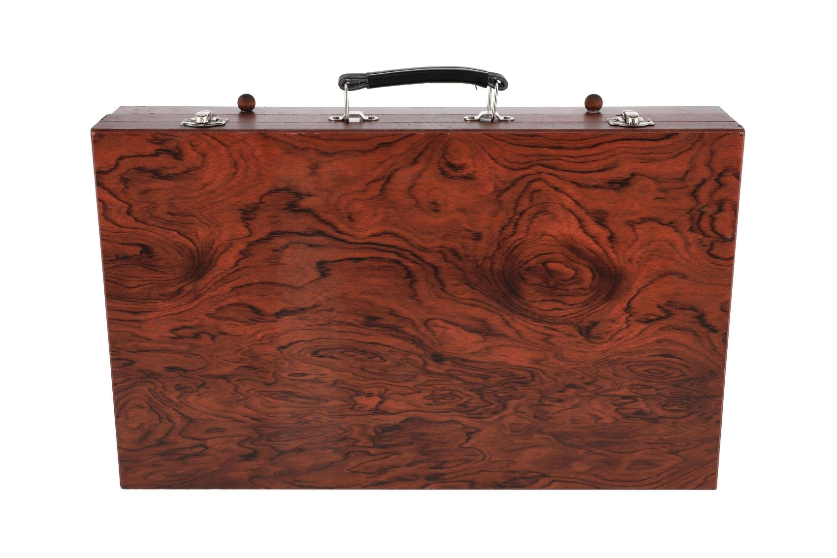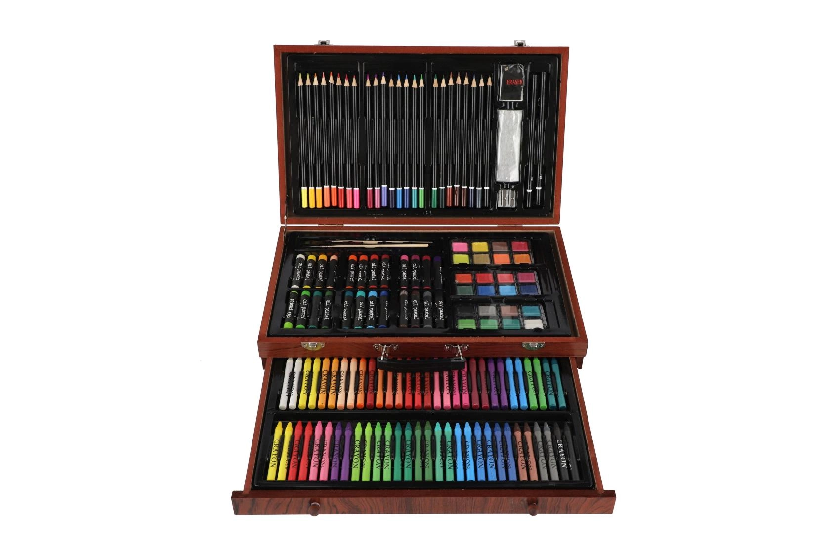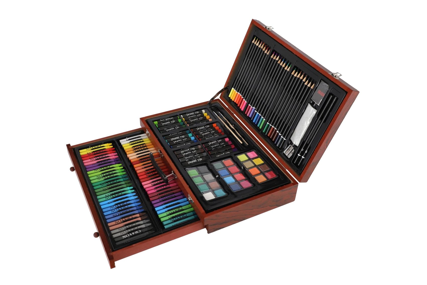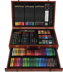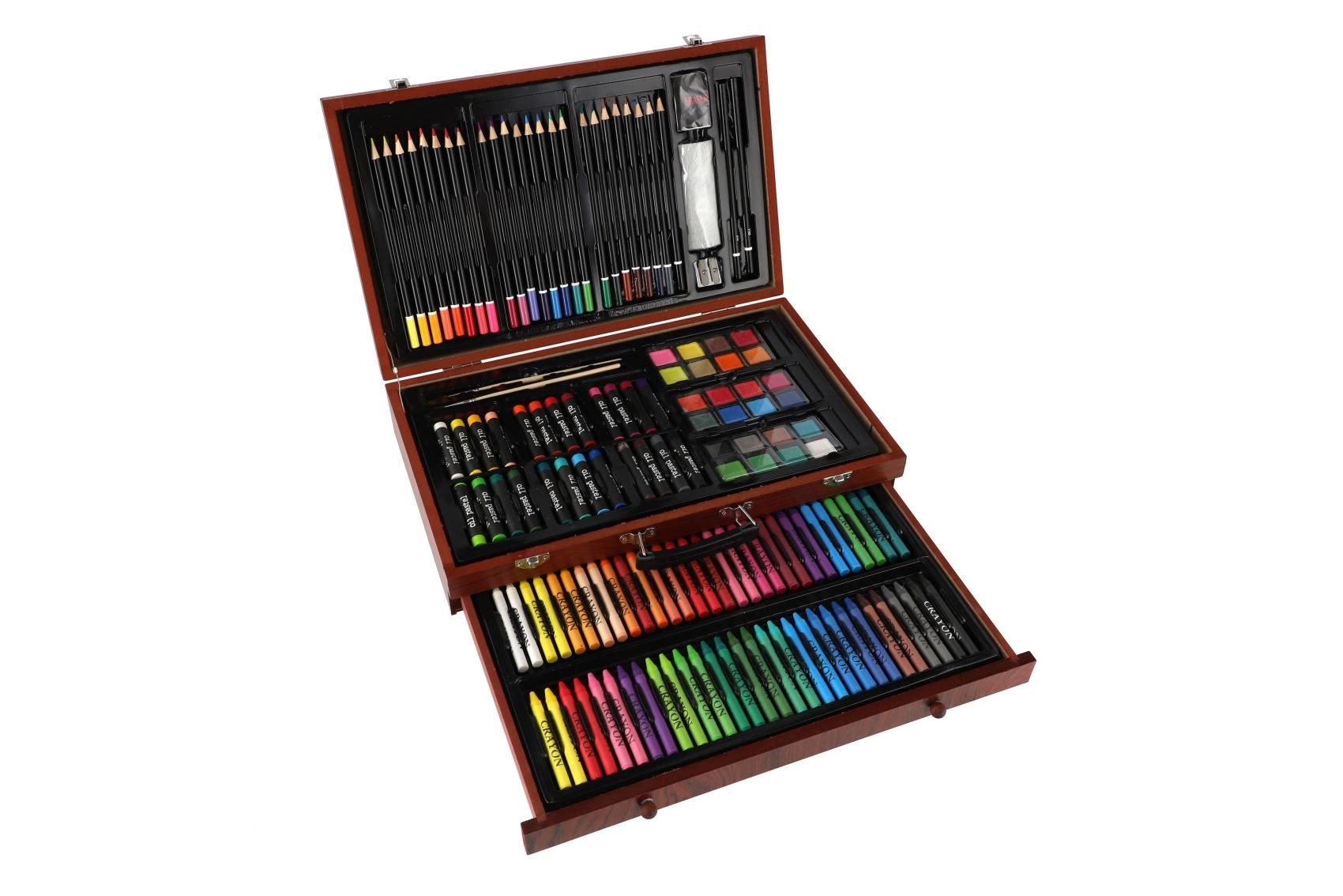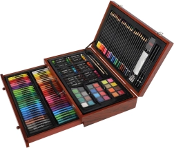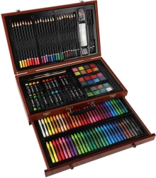 Този богат художествен комплект е отличен избор за начинаещи и напреднали, които търсят всичко необходимо на едно място. Компактният дървен куфар осигурява прегледно съхранение и лесно пренасяне, така че можете да творите у дома, в училище и по време на път.