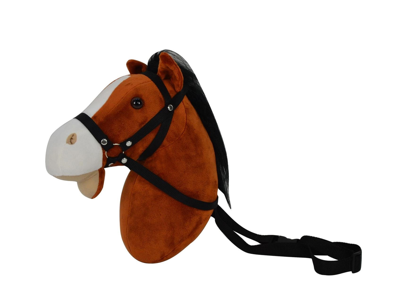 Очарователна плюшена конска глава с регулируема каишка ще зарадва малките любители на коне и малките каубои. Мек материал в тъмнокафяв цвят с бяло чело и реалистични звукови ефекти – при натискане на ушенцето ще чуете цвилене и тракане на копита. Благодарение на регулируемата каишка може да се носи през рамо или около врата. Идеална играчка и аксесоар към костюм за деца от 3 години.