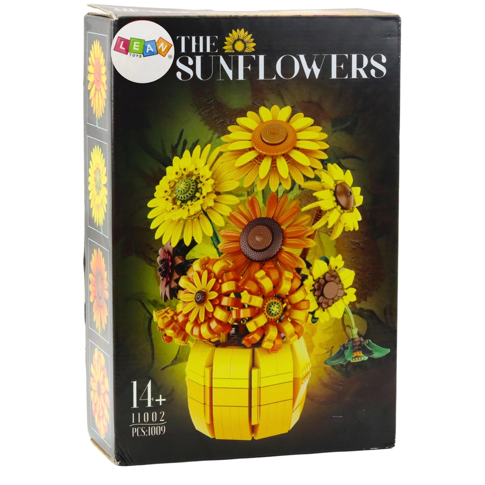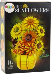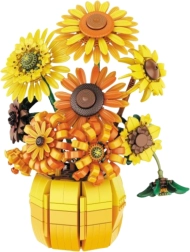 Този дизайнерски конструктор позволява да изградите пространствена композиция от слънчогледи, поставени в елегантна ваза. Всеки елемент точно възпроизвежда формата и структурата на растенията, така че готовият модел изглежда реалистично и декоративно. Хармоничната палитра от нюанси на жълто, оранжево, зелено и кафяво се вписва естествено в модерни интериори, дневни и работни пространства.