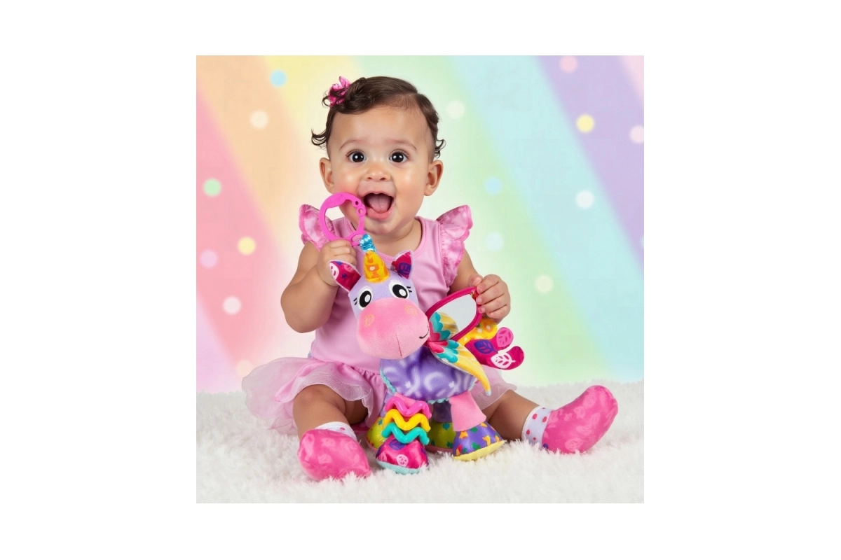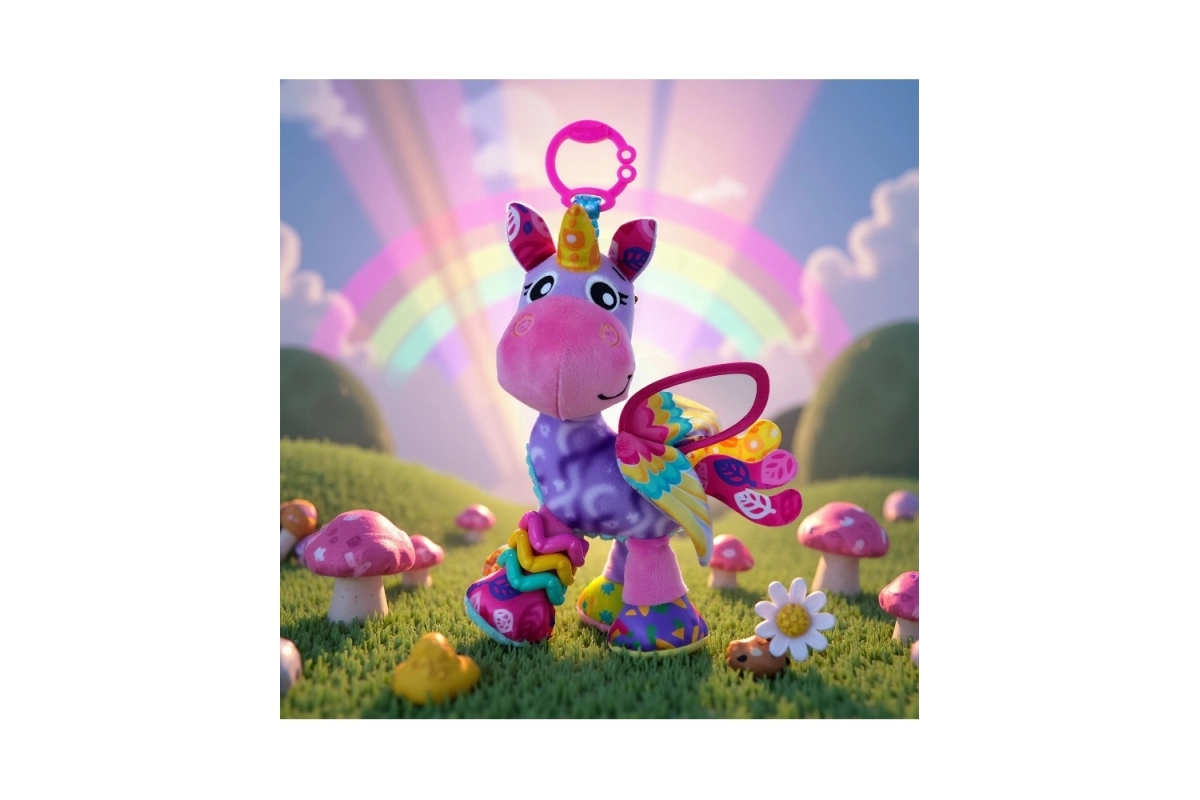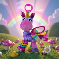 Търсите сетивна играчка, която ще заинтригува вашето бебе от първия поглед и допир? Еднорогът Стела комбинира меки плюшени материали, шумкащи крила, звънтящи халки и безопасно огледалце на крилото. Блестящият рог, сребърното крило и многослойната опашка насърчават любознателното изследване и фината моторика.