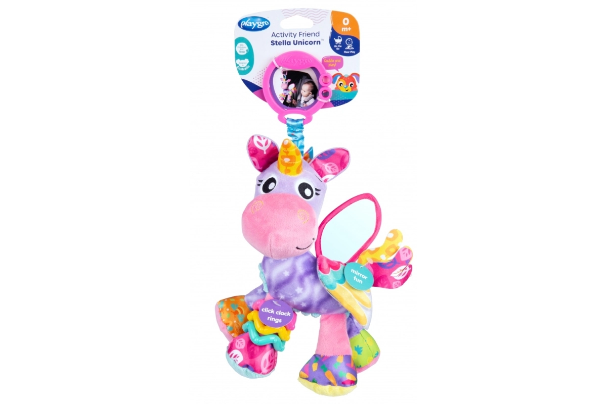 Очарователният еднорог Стела от Playgro е мека висяща играчка за най-малките, която подкрепя развитието на сетивата и забавлява както по време на път, така и у дома. Предлага огледалце за самооткриване, шумкащи и звънтящи елементи, различни текстури и контрастни шарки за стимулиране на зрението, допира и слуха. Благодарение на практичната C щипка лесно я закрепвате към количка, столче за кола или кошара.