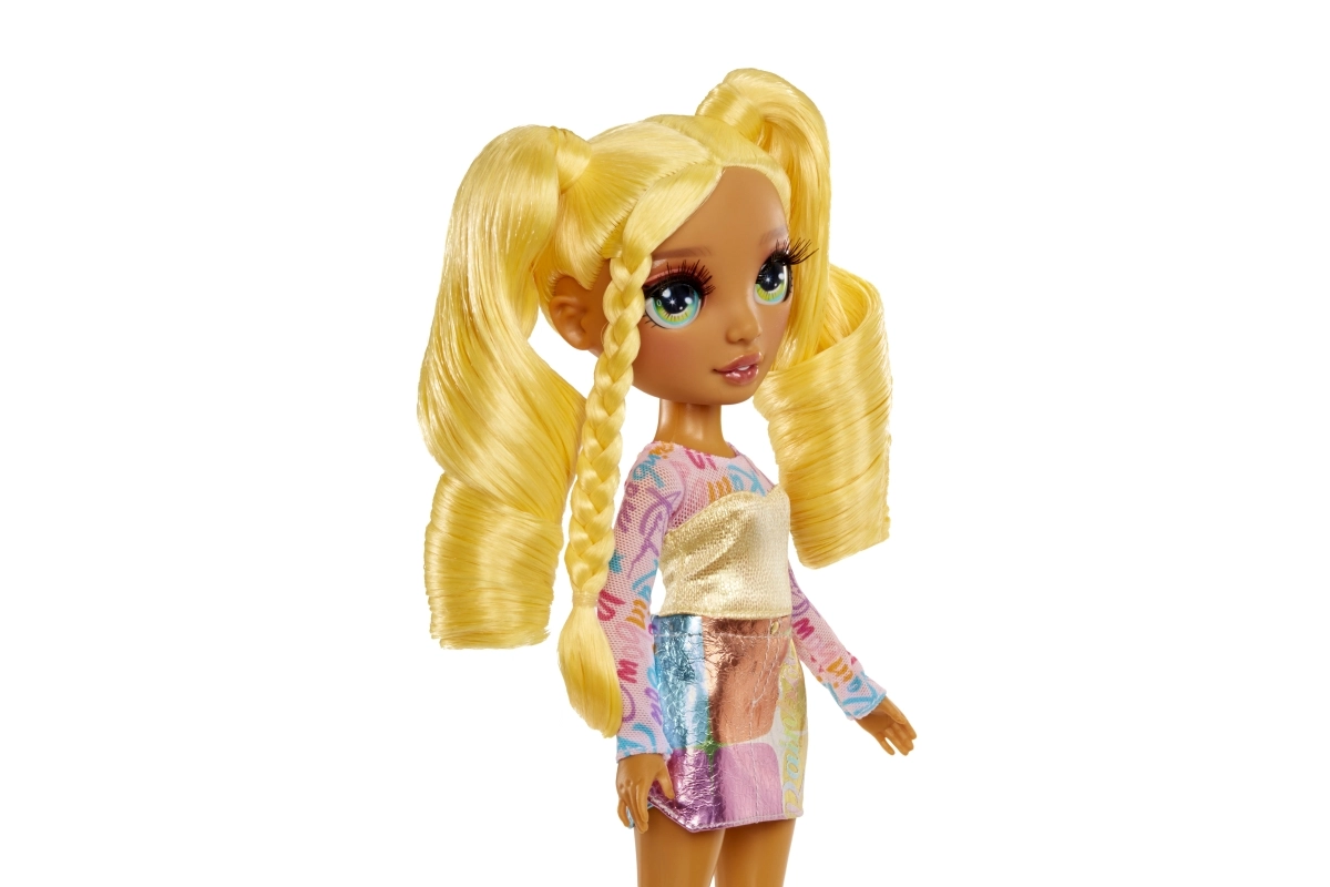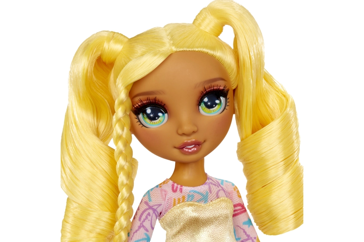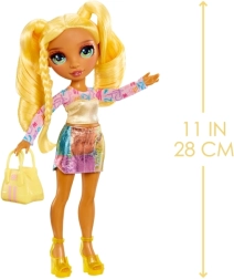 Sunny от RAINBOW HIGH е уверена модна муза, която вдъхновява децата да изразяват своята индивидуалност. Нейният тоалет съчетава сияйни жълти и дъгови акценти – ефектен топ, класическа пола, елегантни обувки на ток и чанта в тон. Косата, оформена в игриви плитки, насърчава креативността при разресване и прически.